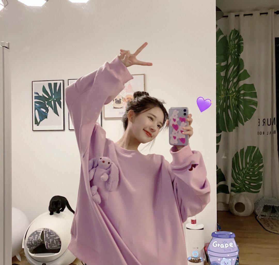 Zhao Lusi wearing a pink sweatshirt is also so sweet, The loose sweatshirt is embellished with rabbits of the same color, which adds a sense of playfulness to the whole look. The loose sweatshirt gives people a comfortable and lazy feeling. It is very suitable for wearing at home. It is casual and free. It is not only fashionable but also very energetic. .