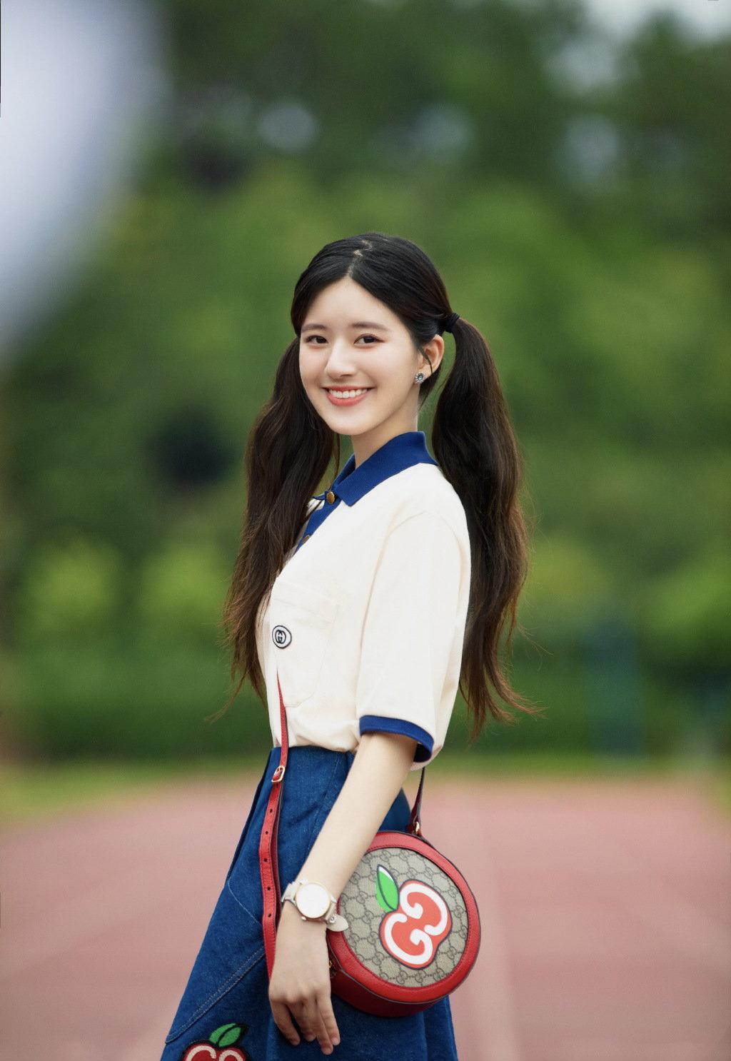 Zhao Lusi, wearing a beige top, has a strong youthful atmosphere. Her lower body is matched with a blue high-waisted A-line skirt, which is full of energy. The top has a blue collar and sleeves. The hem matches the blue skirt just right. With her ponytail tied up, she looks younger, and her healing smile is very charming and generous.