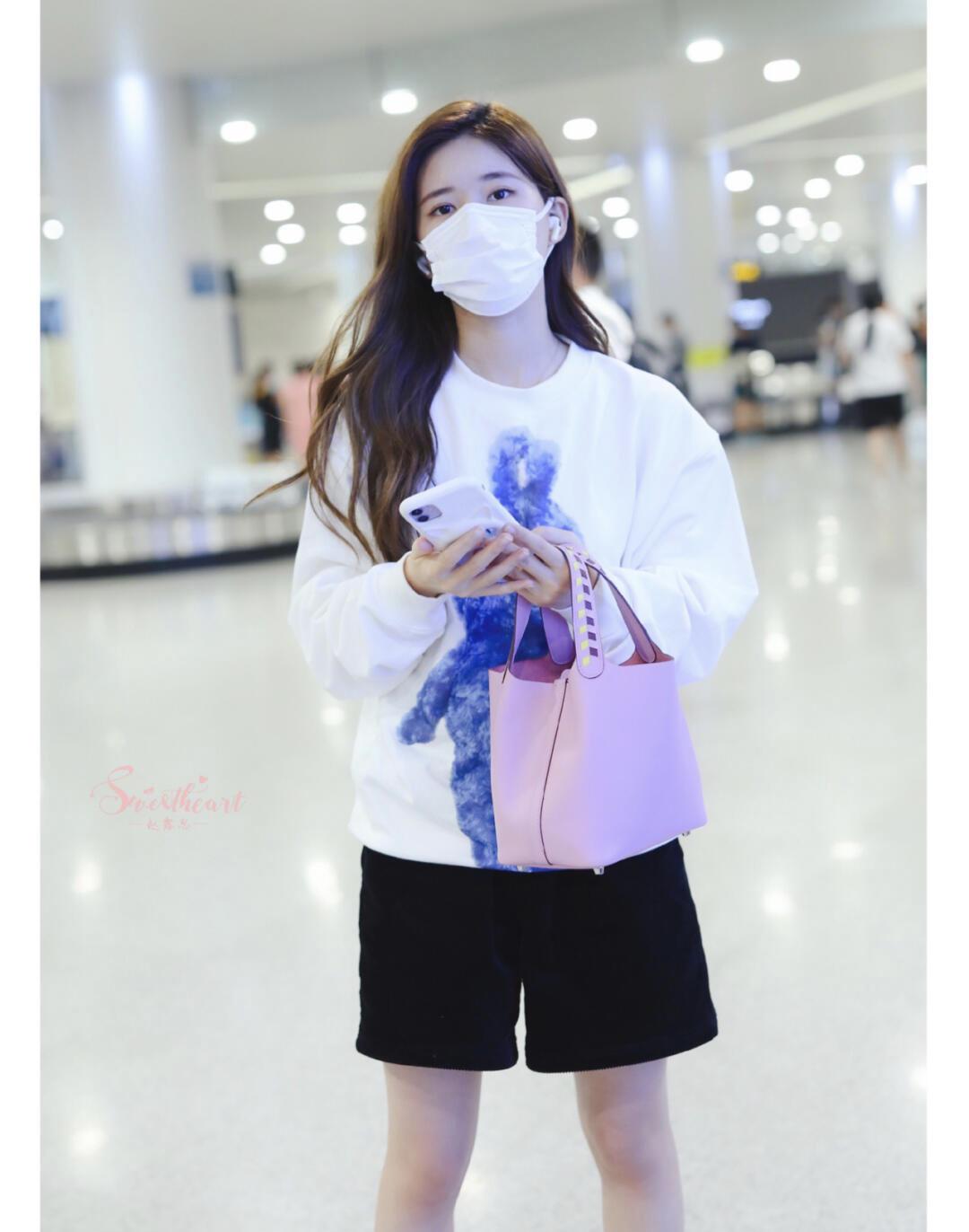 Zhao Lusi’s outfit is also very casual. A white printed top is very comfortable, and the lower body is paired with a pair of black shorts. The whole look is simple but not simple. , with wavy hair, she showed her tenderness, and she was carrying a pink bag. The little girl was full of thoughts.