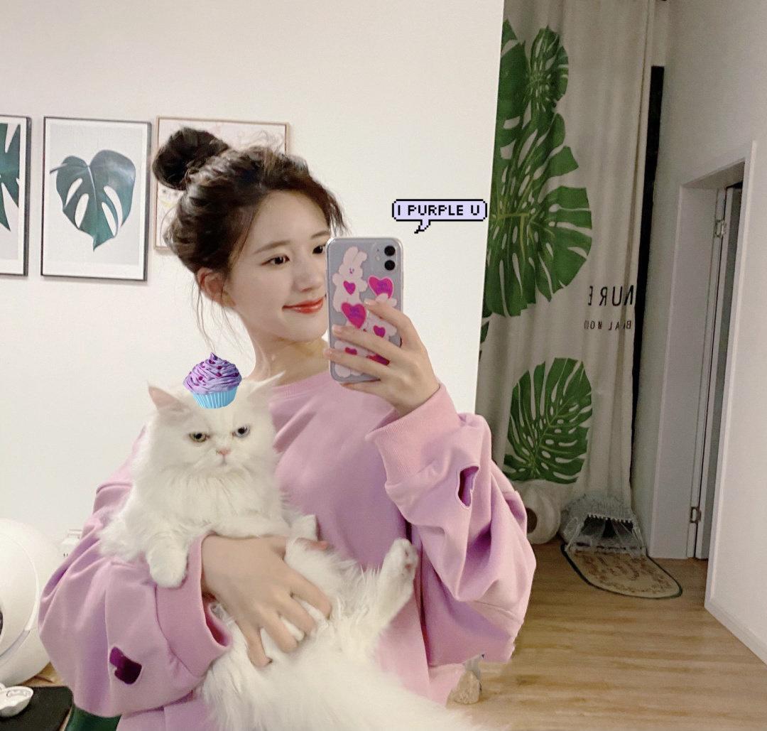 Zhao Lusi with her bun hair is sweet and cute. Taking a selfie with her mobile phone, she looks like a delicate princess, which is very eye-catching. Her skin is in really good condition under the camera, and the cat in her arms is so happy. Zhao Lusi’s style is highly recommended and can be chosen at home or out!
