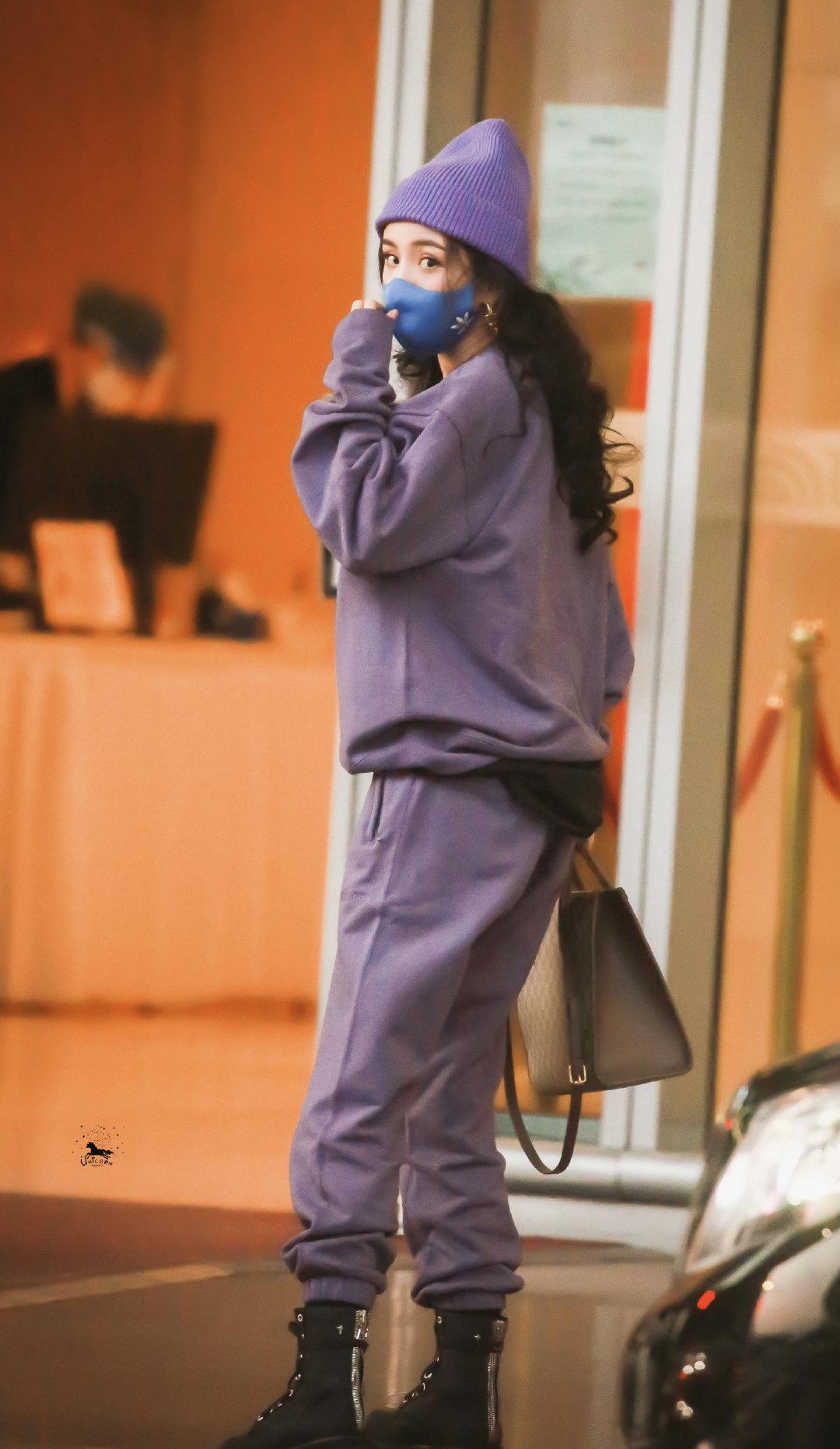 Yang Mi looks really good in a purple sports suit Yes, the purple loose sweatshirt is comfortable and casual. She is also super fashionable with big wavy hair. The lower body is also matched with a pair of sports pants of the same style. The casual outfit is very suitable for daily travel. On her feet is a pair of black boots, which is cool and cool. beautiful.