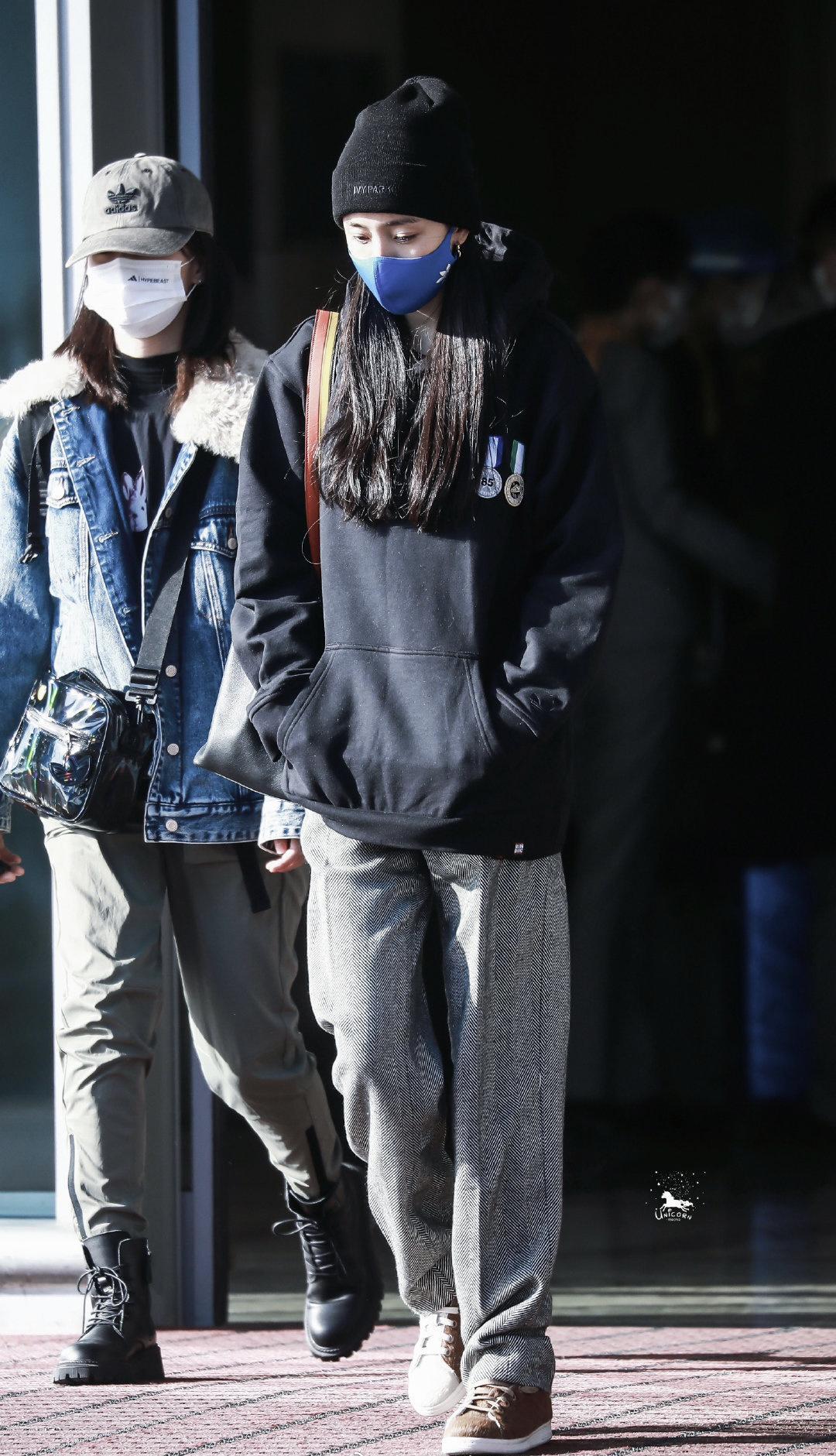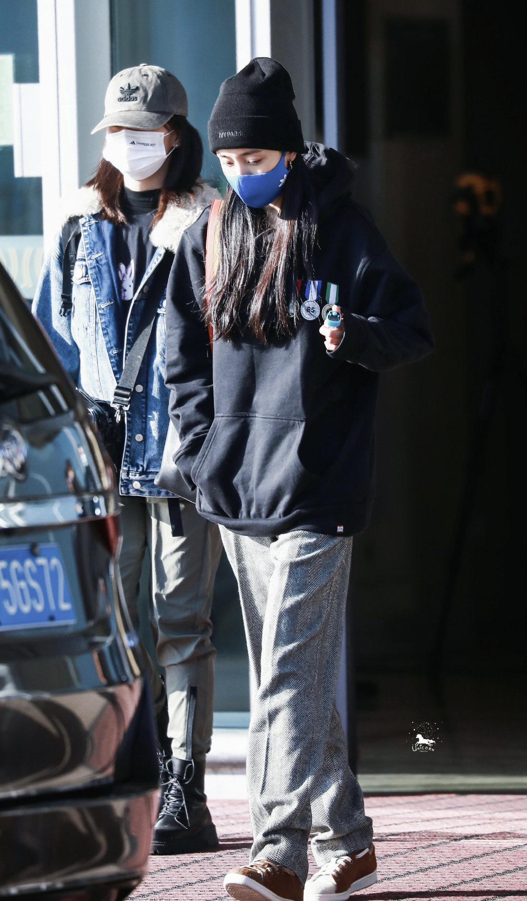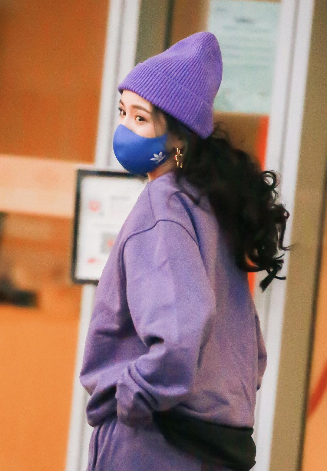 Yang Mi was also wearing a purple knitted hat that day, which was very warm. She was wearing a blue mask and her big talking eyes were very charming. , with a pair of golden earrings on her ears. Under the camera, Yang Mi looks full of youthfulness, super fashionable, and the loose suit is full of comfort.