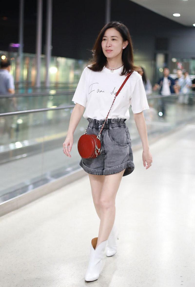 But now Charmaine Sheh is over 40 years old. Although the goddess is not married yet, she is always plump and upbeat, and she wears a very young look at the airport. Oh, pair a white T-shirt with a pair of ripped suspender jeans, and wear white sneakers to walk to the airport easily.
