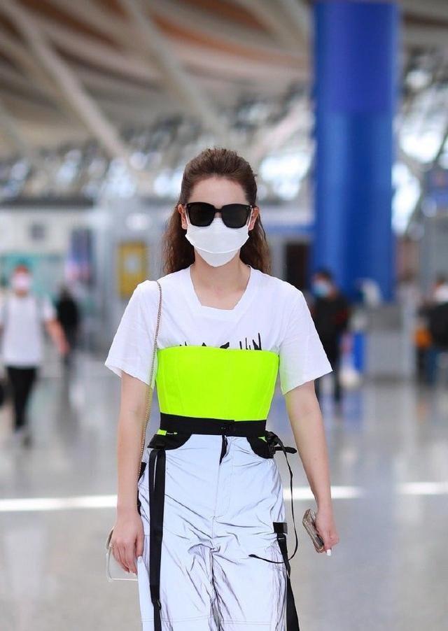 Deng Ziqi, who is very popular in the music industry, is also a fashion lover. Take a look at her T-shirt matching. It is simple but shows different styles. Just like this one, she never forgets her beloved white T-shirt even when she is on stage. The printed design on the chest is particularly eye-catching, and she wears a pair of reflective overalls underneath. Pants, easily become the focus of the stage!