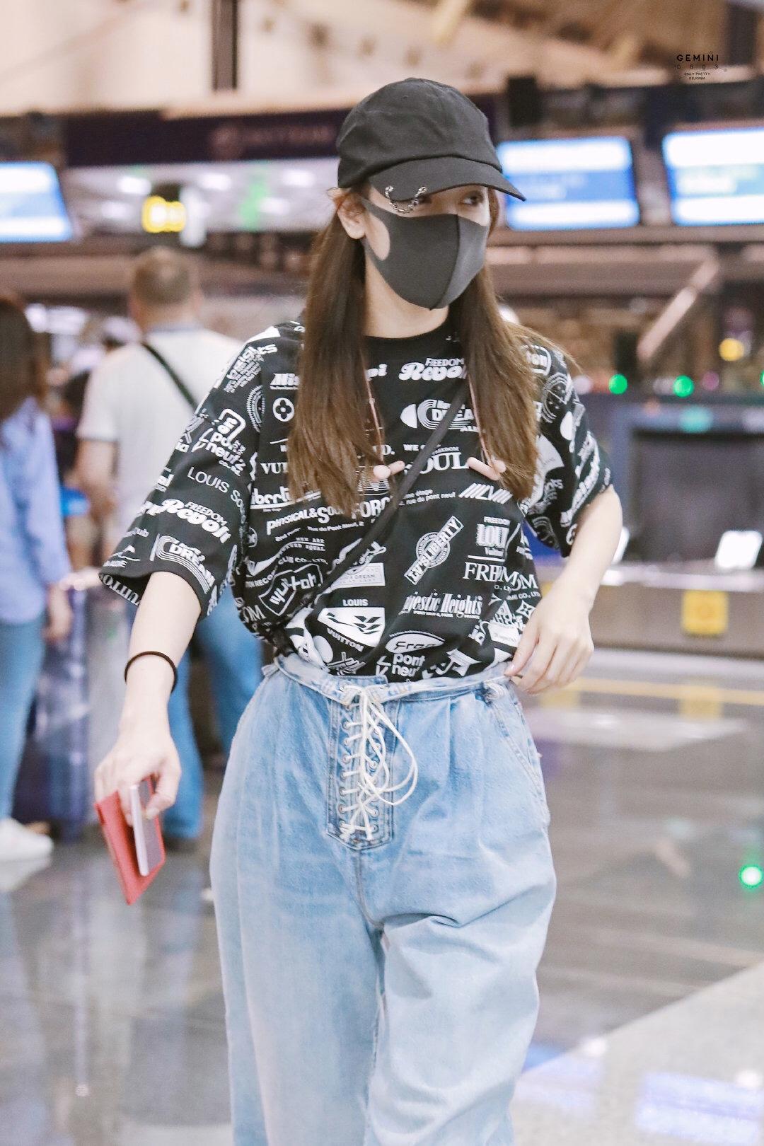This outfit has a very rock and roll style. It is a blue and white letter-printed T-shirt with a particularly cool design on the chest. The red printed design adds a unique style. In terms of matching, Deng Ziqi boldly used a pair of red tight trousers. The particularly bright color scheme has an eye-catching effect. Such a combination with a wide top and narrow bottom, Especially body-modifying.