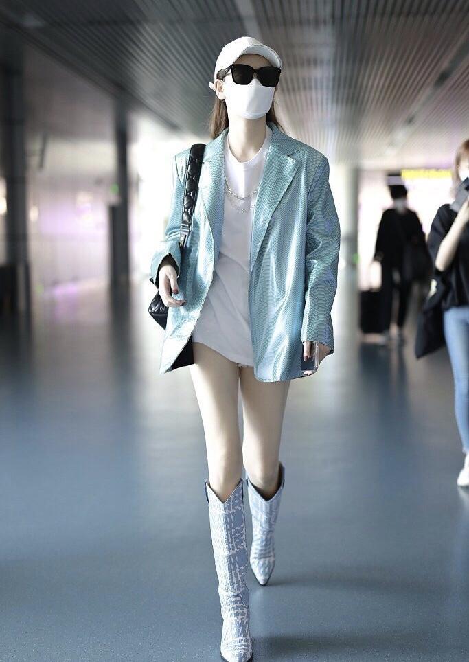 Lake blue leather suit jacket and white T-shirt. The blue and white combination makes the whole outfit look fresh and natural. Wear it with a long T-shirt. Shorts can show how the lower body disappears, and a pair of plaid boots give a high-end look, refreshing and sassy.