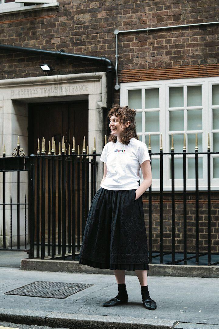 This outfit is particularly cool. The black printed T-shirt and the pattern design on the clothes create a sense of lines, right? Particularly British style? Wear a pair of loose denim trousers underneath. The design is also very careful. Line binding is used at the trousers, which has a very retro design. Pulling the trousers higher will immediately raise the waistline a lot.
