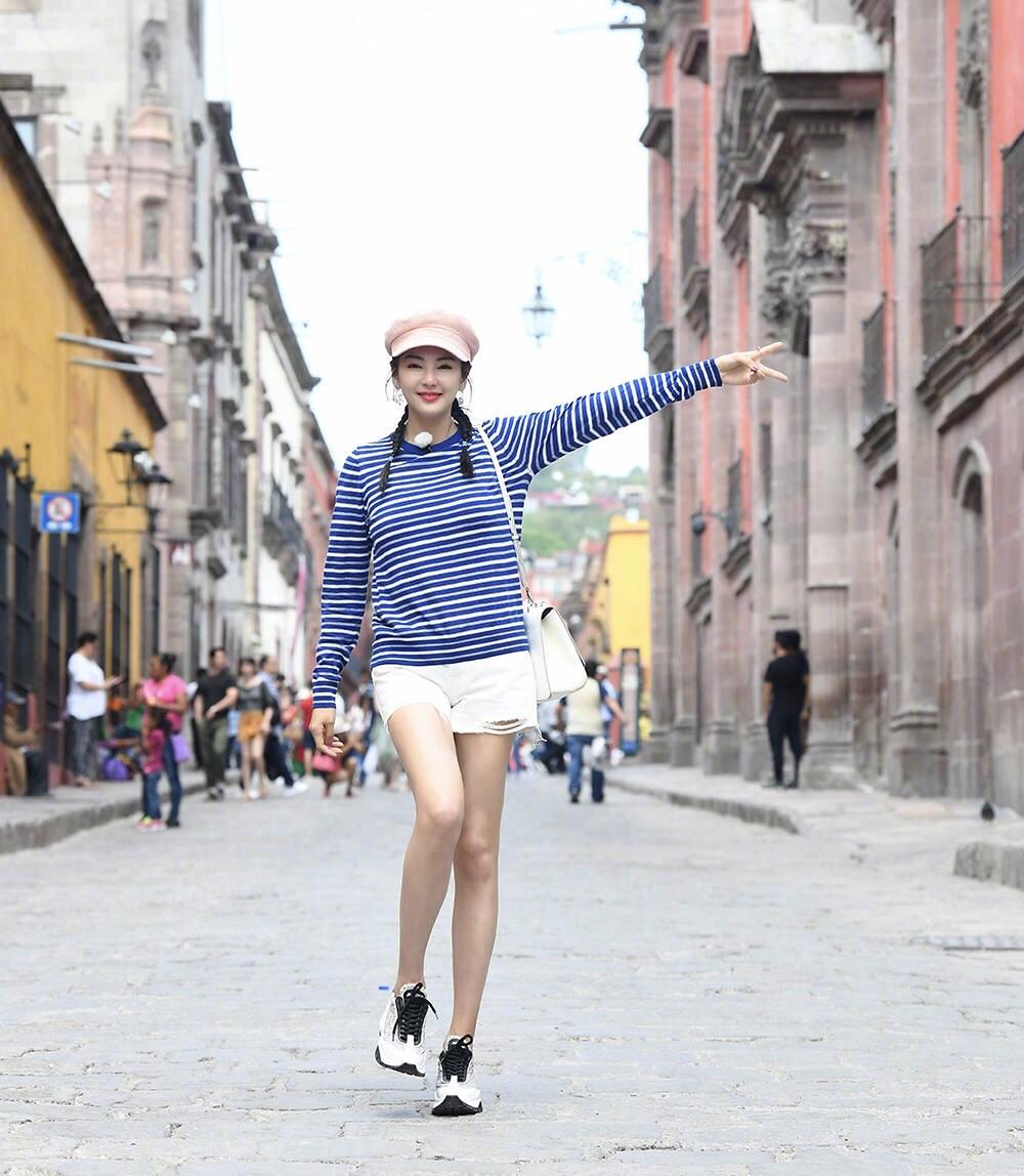 One of the elements that will never go out of style is stripes. Zhang Yuqi used a blue and white striped top, which has a particularly fresh feeling. She used white shorts to control it. Such an outfit is wide at the top and narrow at the bottom. The legs are very long~ And in the details, Zhang Yuqi decorated it with a pink beret and a small white bag on her back. She is definitely a cutie!