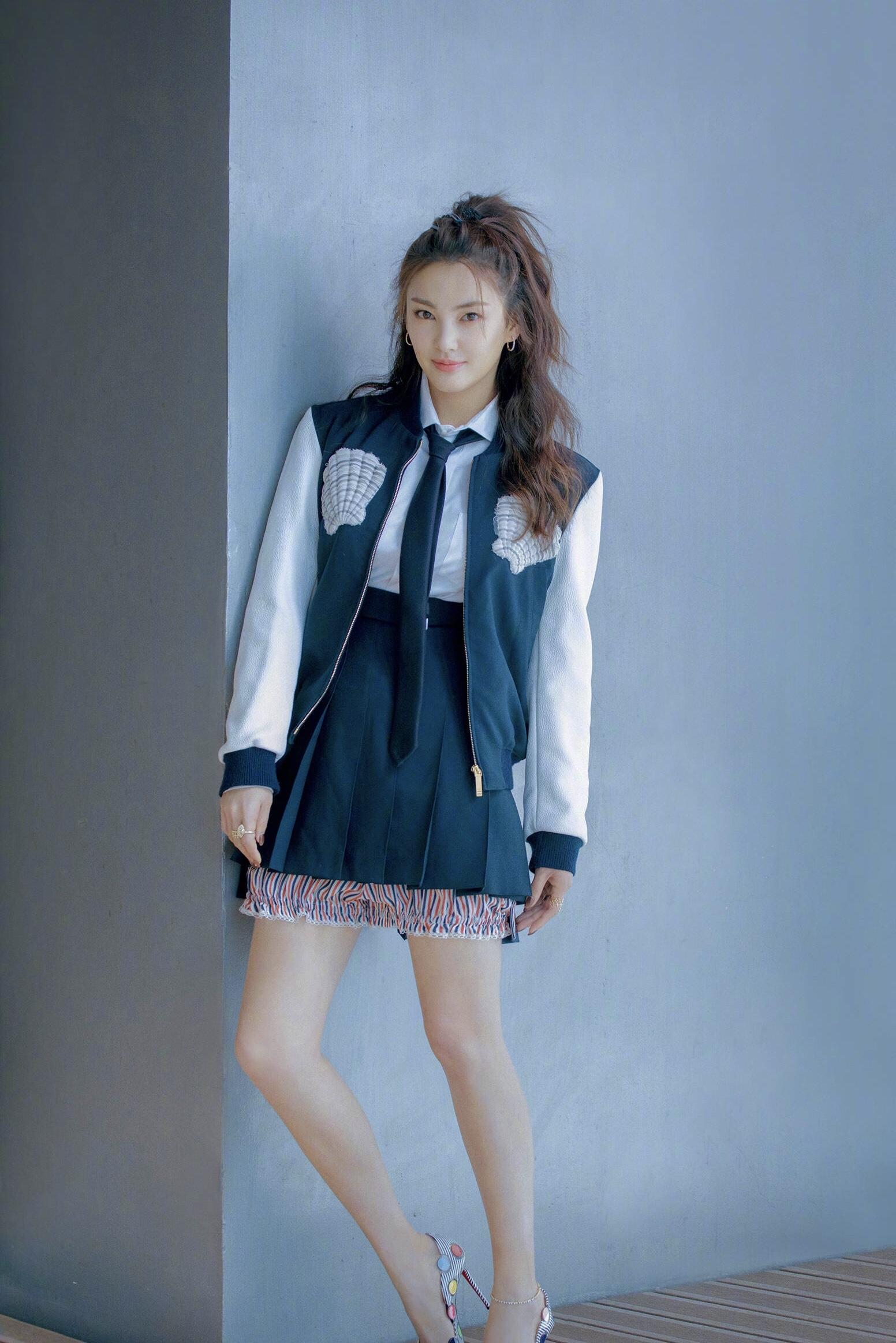 This outfit is more student-style. The blue and white baseball jacket is fresh and age-reducing. A white shirt is worn underneath. Zhang Yuqi also specially used a blue tie to decorate it to echo The function is to wear a spliced short skirt underneath, which is also blue in design, but uses a pink floral skirt design with a splicing effect inside, which is very layered.