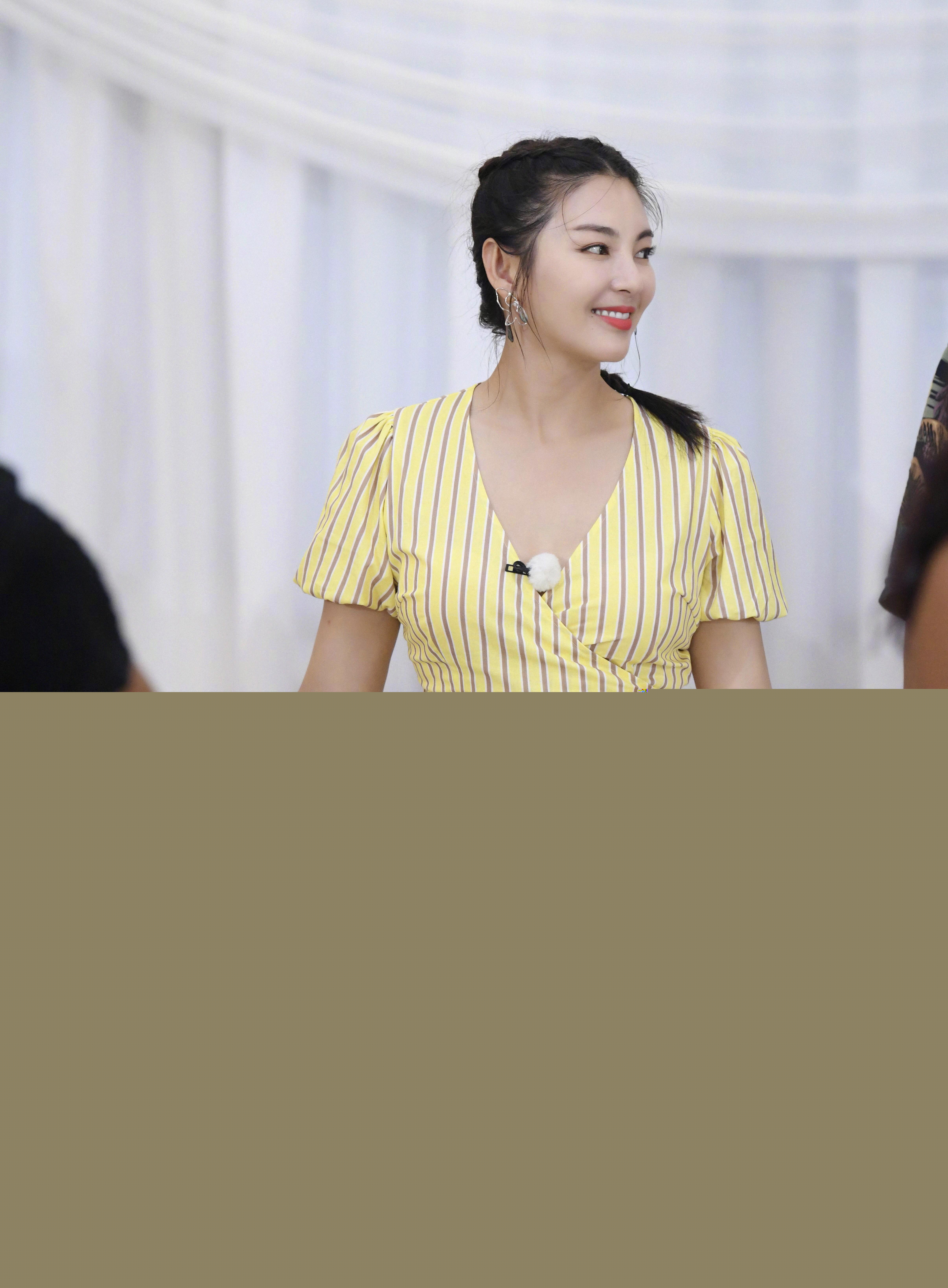 A dress that is essential for summer wear, Zhang Yuqi also chose a very personalized dress The yellow striped dress, the striped design is full of retro feeling, and the big V design is particularly sexy. The waist design of this dress is tied with a thin belt, which is very natural. With the light yellow design, it will not look Too exaggerated.