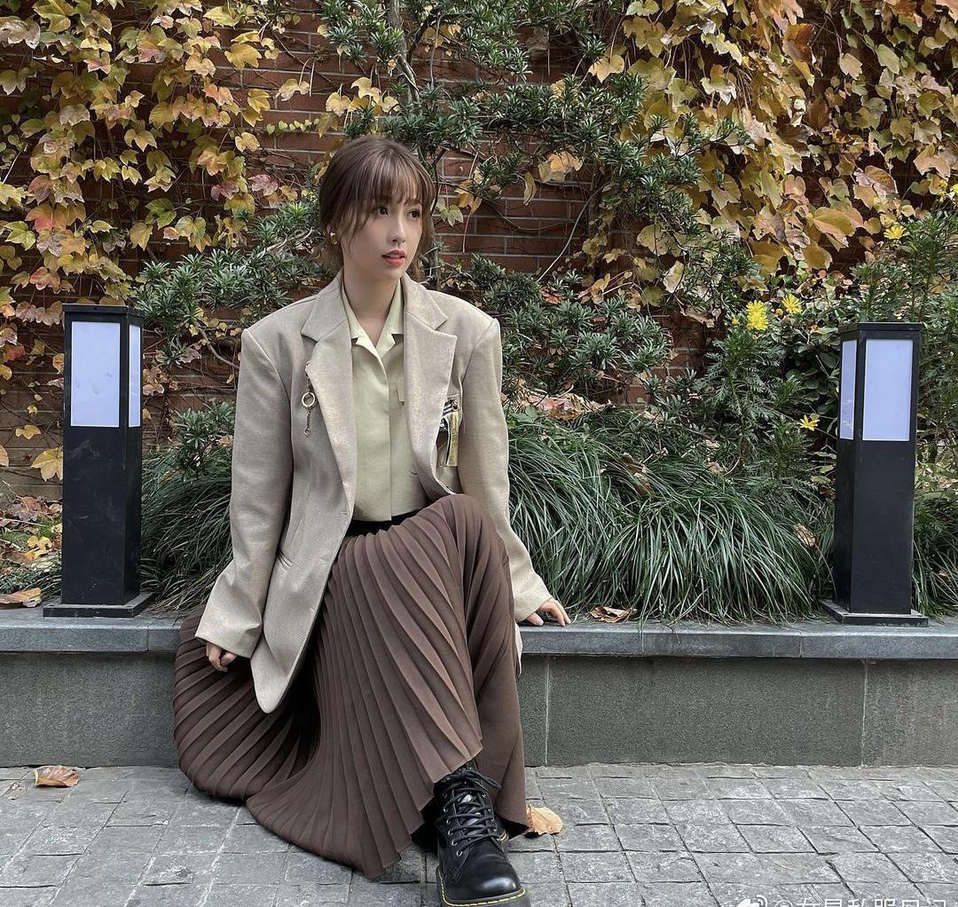 Yu Shuxin wears a light green suit jacket that is full of literary style, with a mint green shirt underneath, which is comfortable and casual. For the lower body, she chooses a brown pleated skirt, a pair of black Martin boots, and a gentle tie With her hairstyle, Yu Shuxin looks exquisite and fashionable.