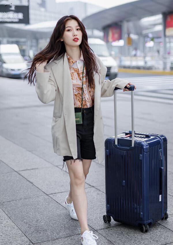 Yu Shuxin looks fashionable and attractive in a gray loose suit jacket, with a printed shirt underneath which is very trendy. The lower body is matched with a pair of black shorts, a pair of white shoes on her feet, and Yu Shuxin is carrying a small green delicate bag. , a flaming red lip is also fascinating.