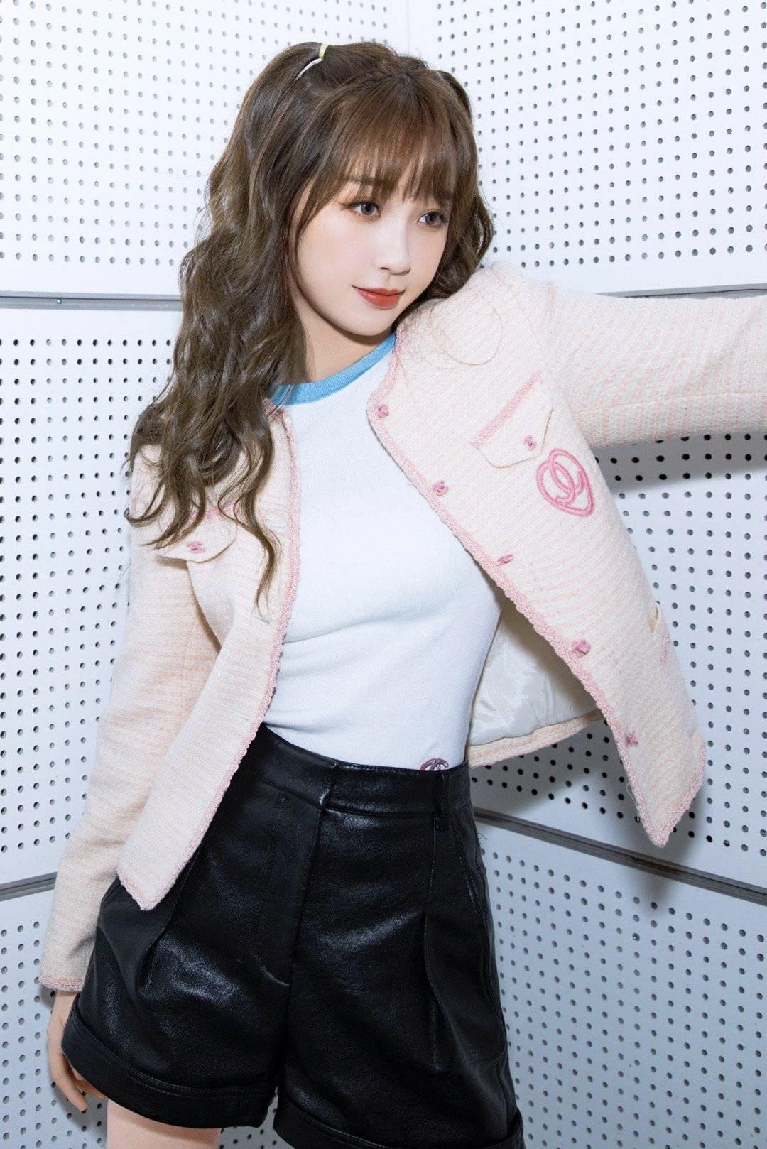 Yu Shuxin, who has her sweet princess hair tied up, is really not too cute. She is wearing a pink coat with a white undershirt underneath. The whole look is full of a little girl’s style, and her lower body is a black high waist. Wearing leather shorts and wearing exquisite makeup, Yu Shuxin looks cute and playful under the camera.