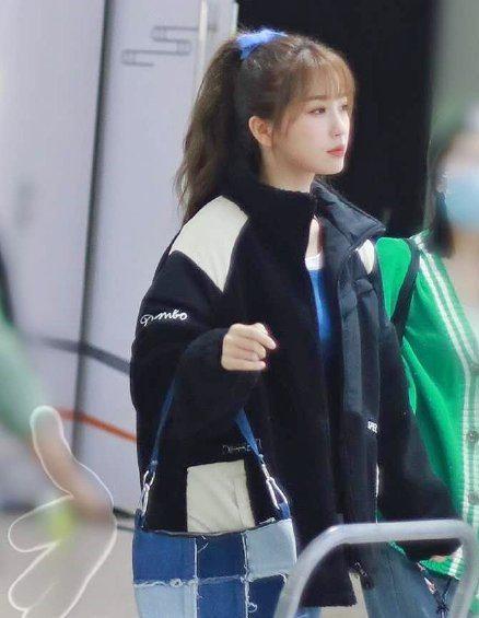 Tie Yu Shuxin, who wears a high ponytail, is very energetic. She wears a white and black color matching jacket, which is simple and fashionable. She chooses a blue bottoming shirt as an inner layer, which echoes the blue hair accessories on her hair. , Yu Shuxin is also holding a blue stitched bag in her hand, and the whole shape is eye-catching.