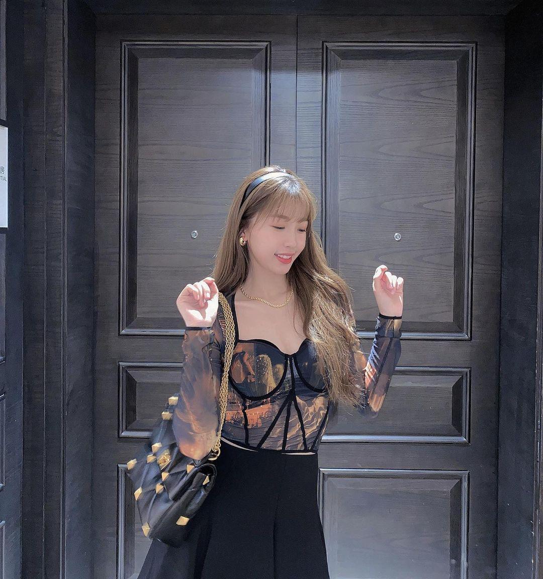 Yu Shuxin’s look is fashionable and sexy. She wears a slim-fitting tie-dye top to show off her feminine charm. She wears a delicate necklace around her neck. Her lower body is paired with a black skirt and she carries a golden Yu Shuxin wears a chain bag and fashionable earrings, showing her charming temperament.