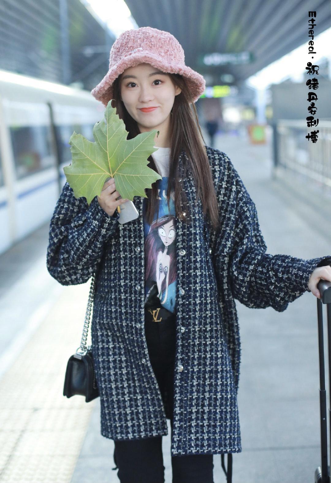 Zhu Xudan is wearing a black plaid coat The style is very fashionable. She wears a white graffiti top as a base and a pair of black casual trousers on the lower body. Under the camera, Zhu Xudan is very elegant wearing a pink lambswool fisherman hat, with long silky hair. Full of eyesight.