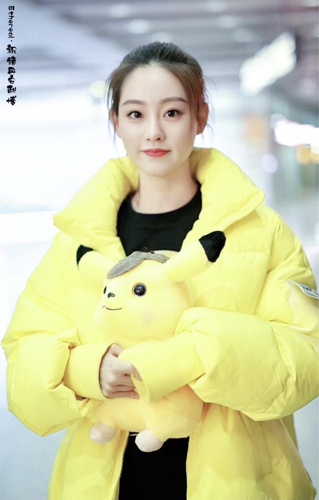 Zhu Xudan, wearing a yellow down jacket, is also full of energy. Wearing a black top underneath, the combination of black and yellow is really super attractive. Zhu Xudan has her hair tied up, and her facial features are delicate and sweet. She is also holding a cute yellow Pikachu in the camera, showing her fashionable atmosphere. .