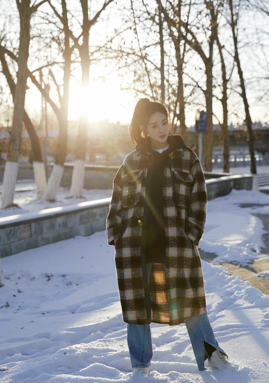 Zhu Xudan’s lower body is matched with a pair of blue jeans and a pair of white casual shoes on his feet. The slit design on the legs of the jeans makes the whole Zhu Xudan looks very charming under the sun and snow. She is wearing exquisite makeup and her high ponytail is super age-reducing. The whole picture is full of romantic feelings.