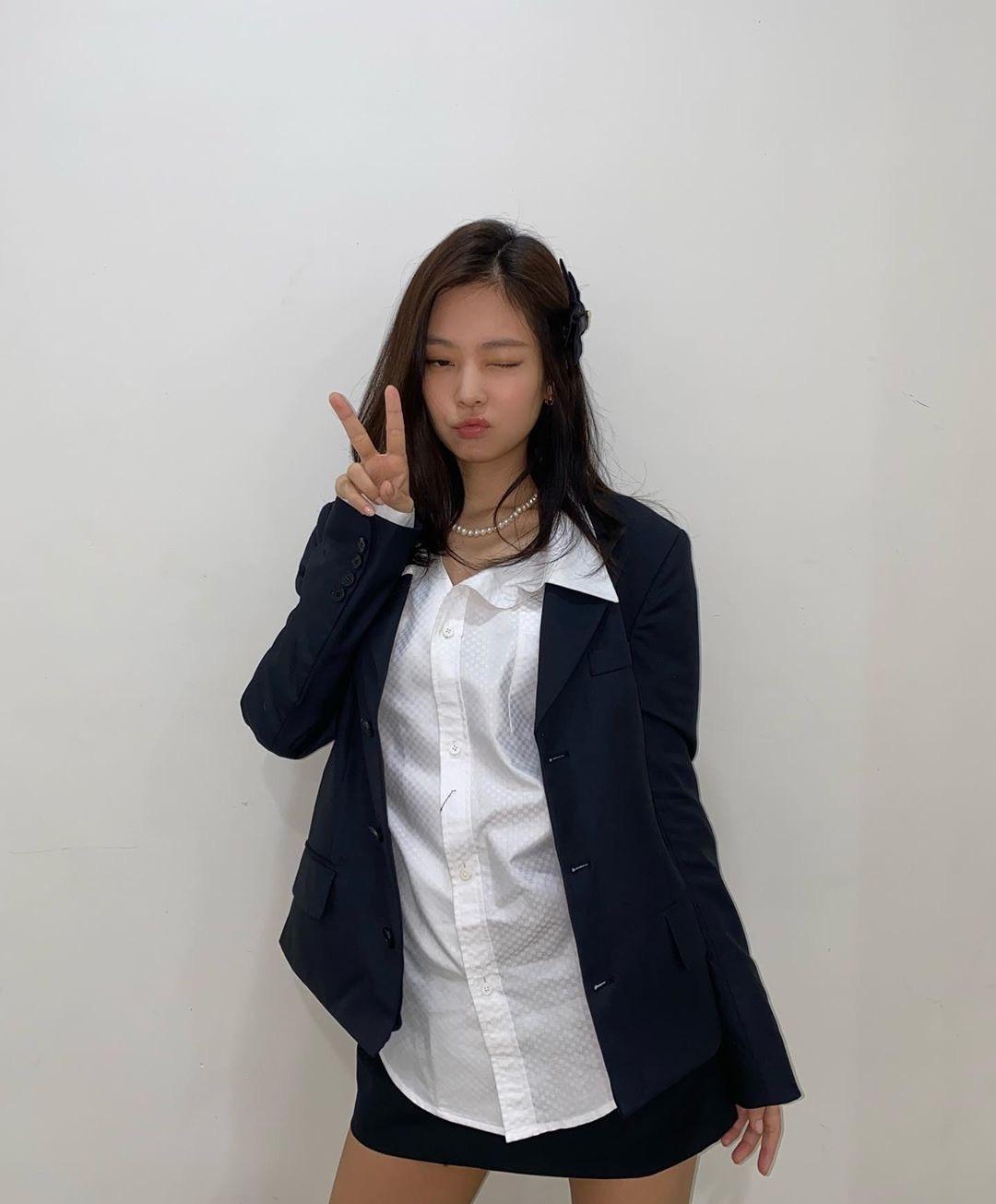 Here comes, fashionable outfit posts often Guest – Suits. As a real fashion actress, Jennie is also unique in the choice of suits. This irregular suit with exposed navel and back is very attractive in terms of style. It is paired with high-waisted wide-leg pants. The legs are almost 1.8 meters long.