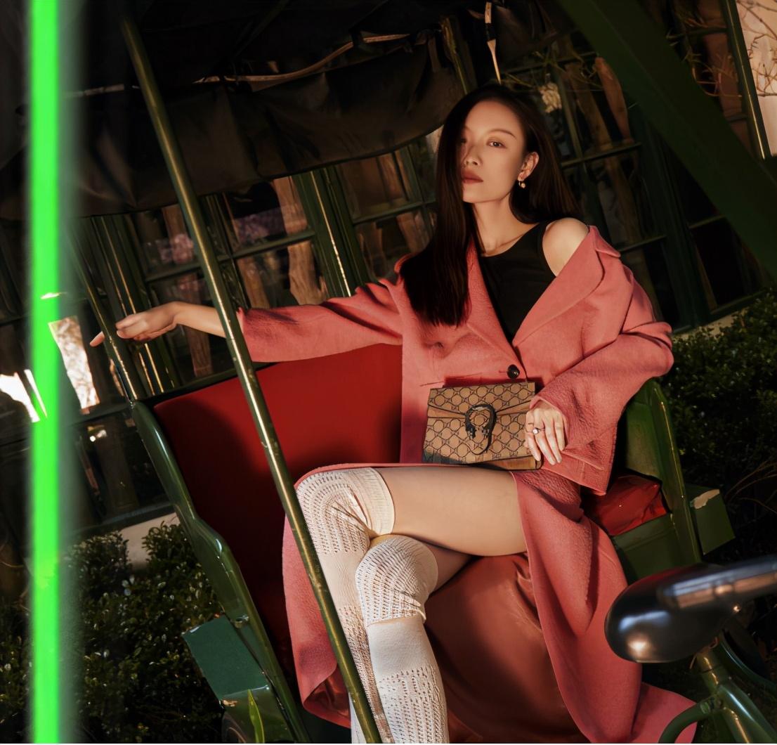 Here we can see that Ni Ni wears a black vest as a base for her upper body, which highlights her excellent right-angled shoulder lines. She is very charming and can be worn outdoors. A pink coat and long skirt, the collar of the coat can be pulled down casually to make it more lazy. The white stockings on the legs add to the elegance. The hollow design is very eye-catching, and it is a very literary and retro look.
