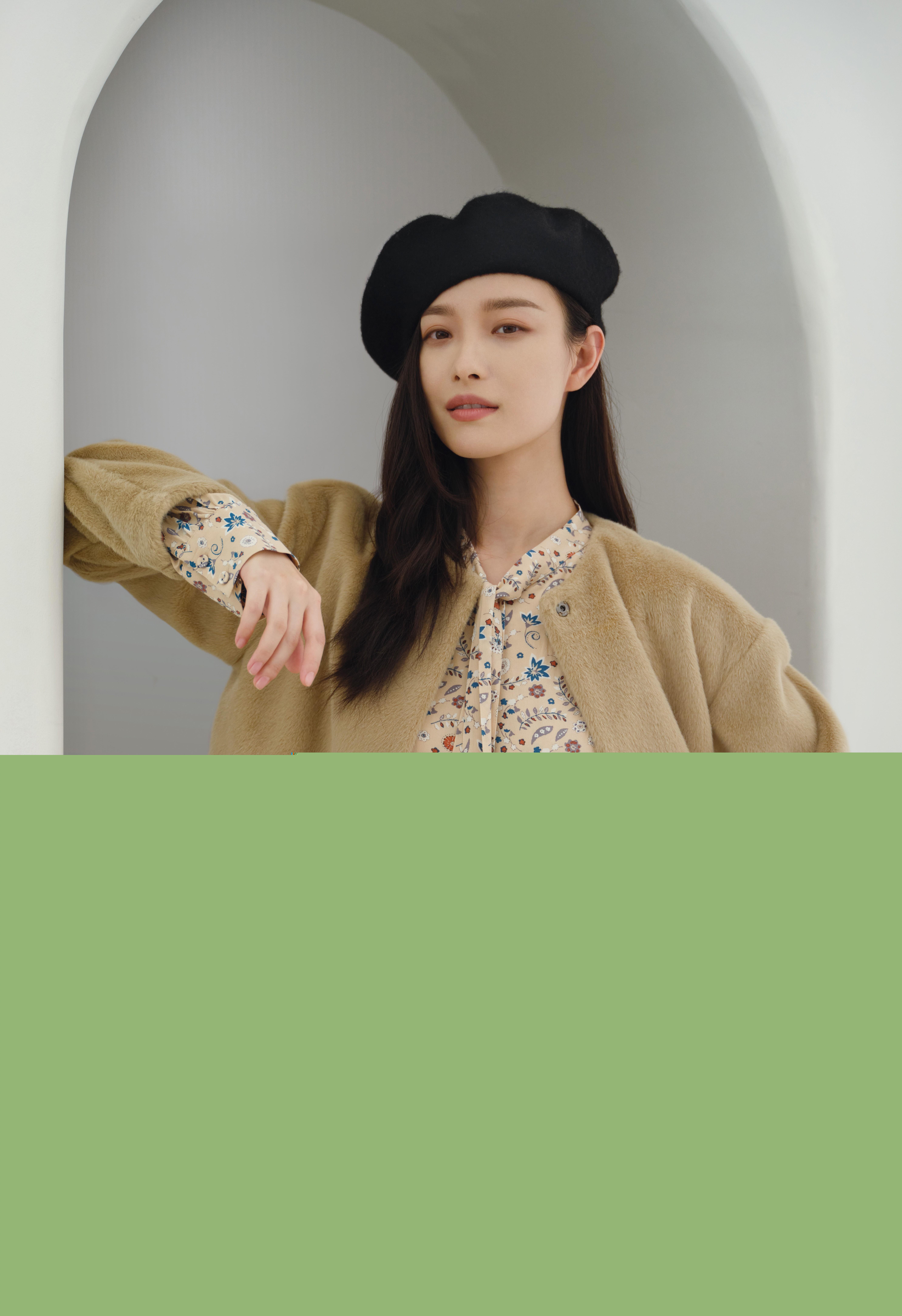 A very literary and artistic goddess outfit. Here Ni Ni wears a beige top on her upper body to show her style. The large floral pattern is very good It embellishes the body and looks more elegant. The ribbon at the neckline is very eye-catching, adding an elegant atmosphere. It is paired with a camel-colored plush jacket, which is very layered. The lower body is paired with a pair of dark blue high-waisted jeans, which shows a powerful look. The aura is very eye-catching.