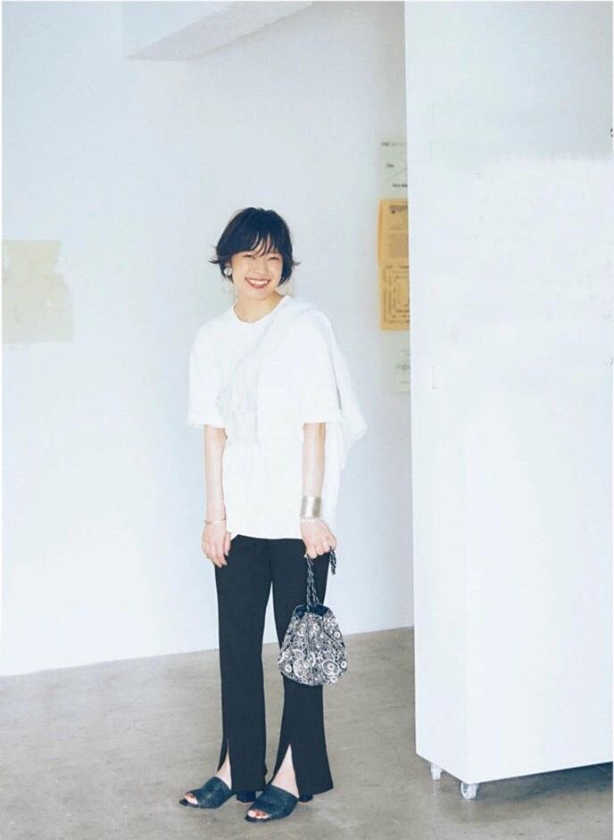 The loose white short-sleeved style is too long. If it is spread out at will, it will easily appear that the legs are short, but we can do the opposite and use this dragging feeling to Forming a unique charm, the slim skirt adds slits at the ankles to lengthen the legs, but the overall casualness is in line with the style of the top. Pair it with a bag of the same style to brighten it up, and the overall outfit is unusual but intriguing.