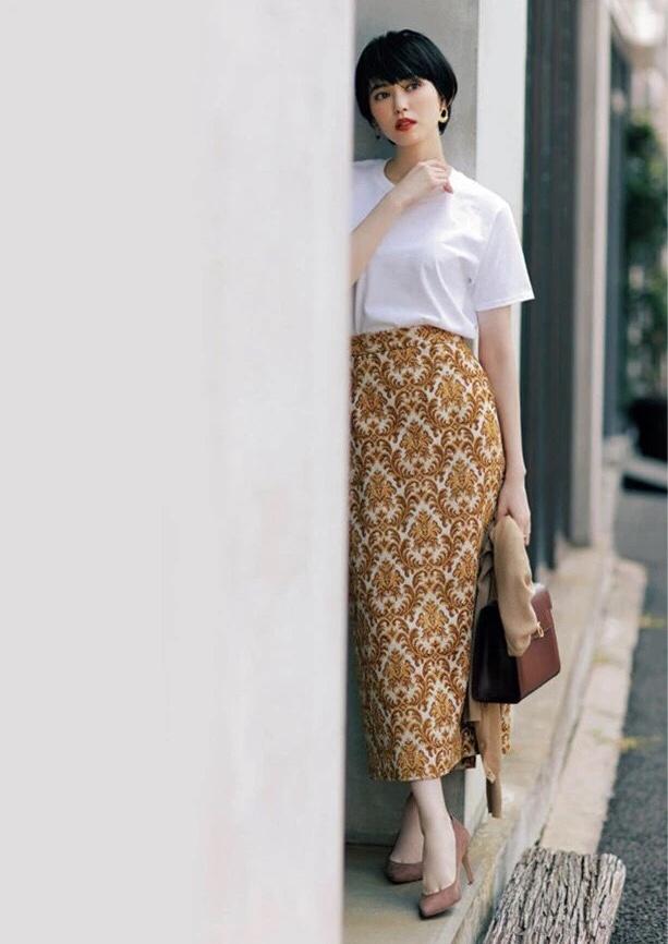 It is difficult for us to change the characteristics of white short sleeves, so we can start with other matching items, such as wearing a very designed skirt to form a highlight, which will show the benefits of white short sleeves. It’s okay if it doesn’t steal the show. The skirt here is matched with the shoes and bag in the same color, making the whole look more integrated without too much jumping.