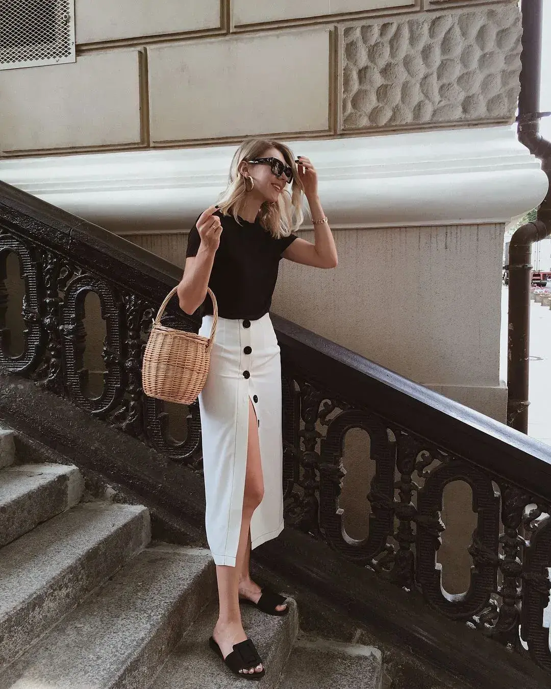 The most neat and elegant thing is the white hip-covering skirt with slits in the front. The legs are looming when walking and it is very charming. Use it with a black T-shirt T-shirt, the color contrast is minimalist and high-end, especially slimming.