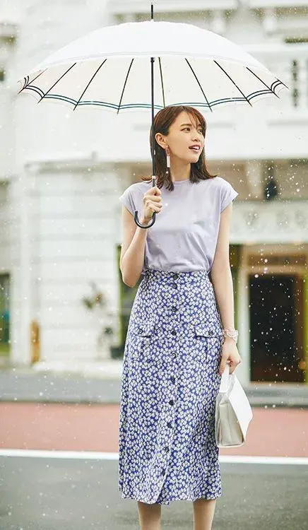 Recent time Long skirts are particularly popular here. Long skirts have a softer and quieter feel than short skirts. They are especially friendly to girls with thick legs. They are especially suitable for matching T-shirts. Even when going to some formal occasions, they will not be excessive. Casual or childish, like this purple floral skirt with a row of buttons added to the front opening, paired with a purple T-shirt of the same color, it gives people a particularly relaxed feeling, but is also very elegant and advanced, and is no problem for daily commuting. .