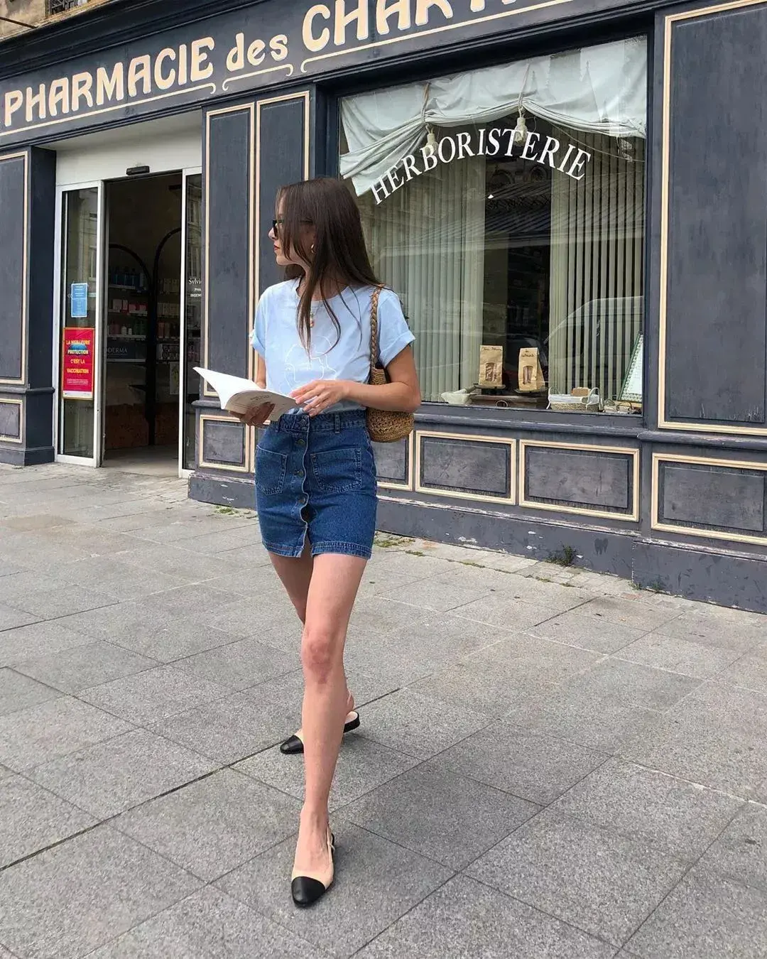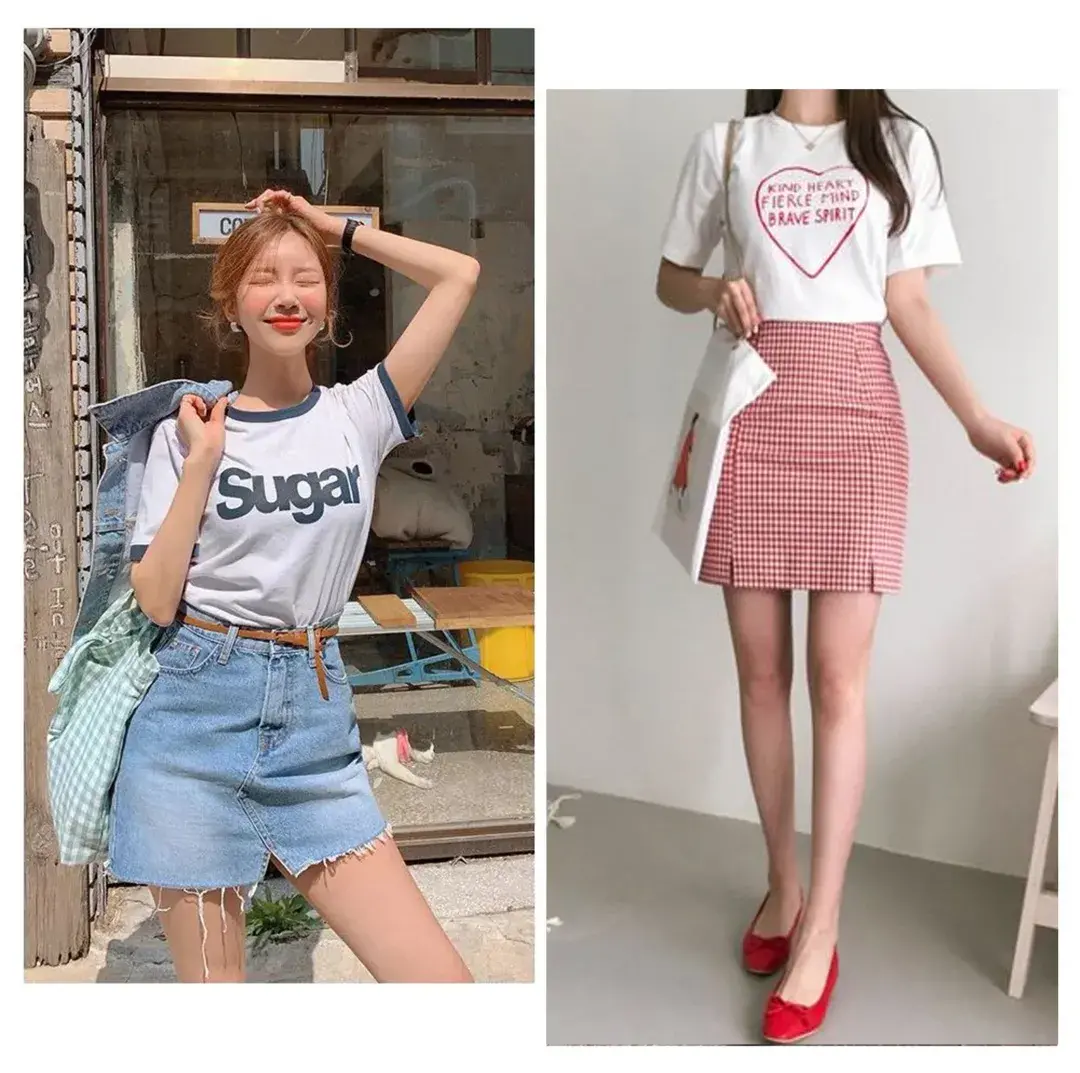 Short skirt and T-shirts can be said to be the most suitable match for temperament. The super young and casual qualities complement each other and are particularly suitable for young friends. It is also particularly eye-catching to expose your legs in the sunny summer. Among them, the best and most classic combination is a T-shirt and a denim skirt.
