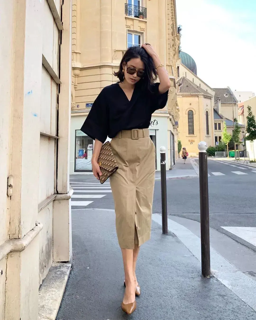 If you want to go for daily commuting, it is no problem to match a T-shirt with a short skirt. You can choose brown or military green for the skirt. Waiting for the retro color to be added�The texture. Like this military green front-breasted hip-hugging skirt, it still looks rigorous. Pair it with a T-shirt and sneakers, and you can wear it for both work and leisure.