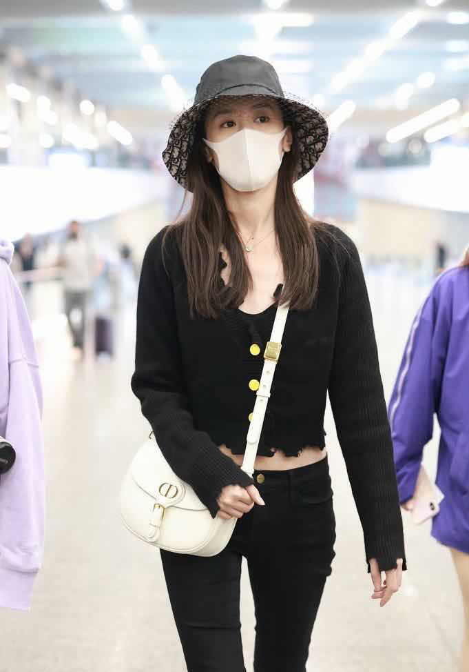 Short on top The lower length is a very obvious girl group style outfit, showing off your first-class figure! Yuan Bingyan chose a simple black navel-baring sweater for this outfit. The yellow buttons look cute and cute, and the small waist is very eye-catching. It is paired with black tights to increase the overall proportion and highlight the graceful figure. Wearing a fisherman hat is a versatile, casual, fashionable and attractive look!
