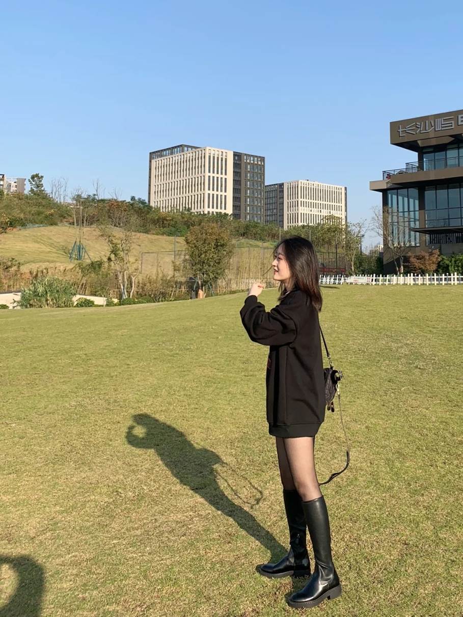 BF style The sweatshirt and boots can create a sweet and cool style. Yesterday, the editor tried the hard boots, which are really very leg-slimming. They make the legs look long, straight and thin. I want to wear short legs in autumn and winter but I am afraid of showing off my legs. Thick little fairies can give it a try, the effect will definitely surprise you~