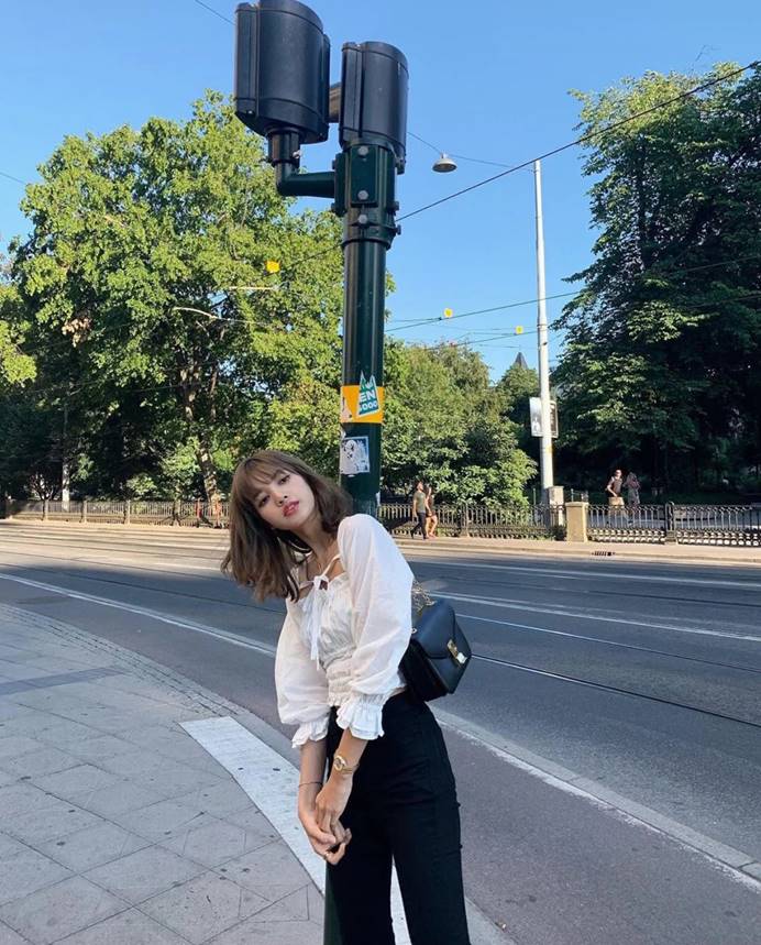 LISA wears this short top to show off her superior figure. The tight jeans make her legs look long and straight, with a pair of armpits. Wear a small bag to look sophisticated and fashionable. This outfit looks very good in any photo taken.