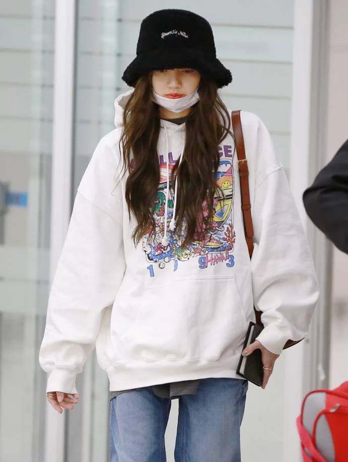 In the airport outfit taken by fans, LISA is also in very good condition without makeup. A large sweatshirt is very casual, paired with a pair of wide-leg jeans and a sweatshirt. It also matches well. A black fisherman hat is very low-key. How would you rate such a spicy LISA?