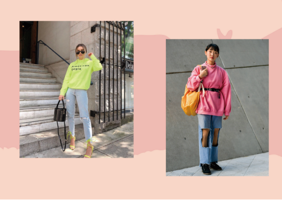 For sweatshirts with a slightly darker color, you should choose darker jeans. Fluorescent green sweatshirt combined with letter print, this outfit has more highlights highlighted in the color of the clothes