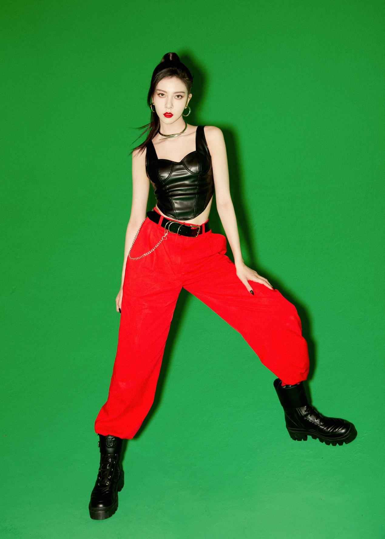 The next red and black outfit is full of coolness! The combination of red and black is very classic. Song Yanfei chose a black leather vest for her top, which can perfectly show off her delicate collarbones and slender waist, and leather clothes will always With a touch of cool! Paired with a pair of red harem pants and a pair of black Martin boots, it looks so cool! Pair it with a high ponytail and stunning red lips to unleash your infinite charm!