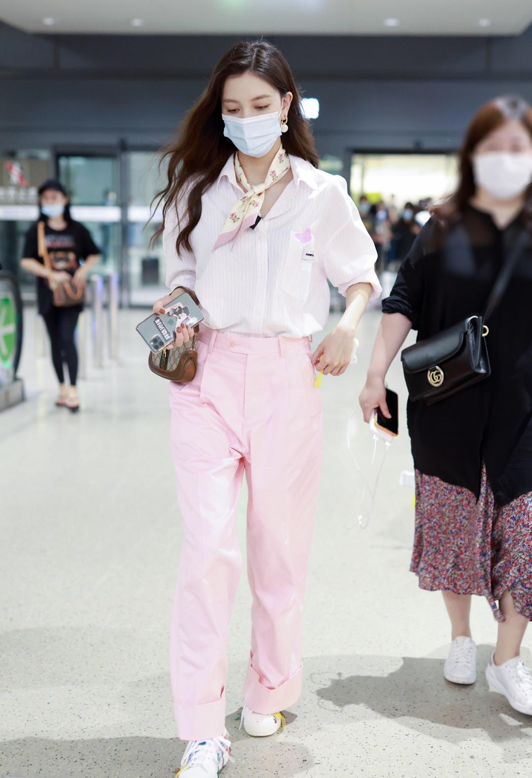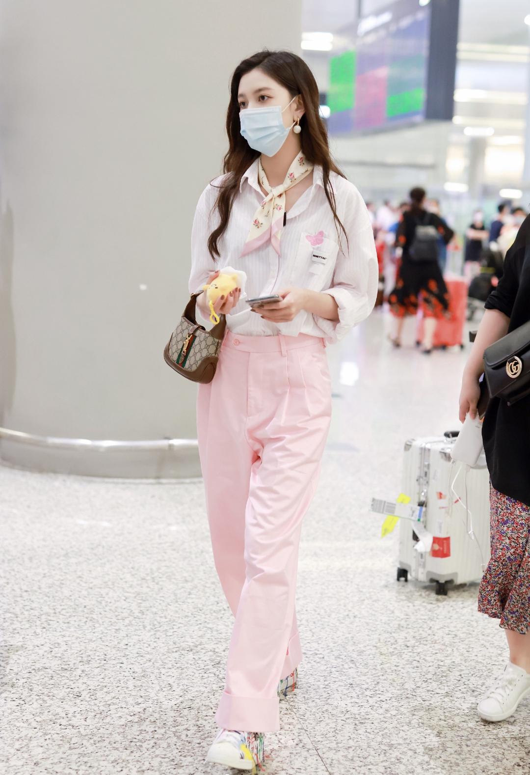 It is also an airport outfit, but this one shows a girlish look. In fact, the overall color of this outfit is mainly pink. She wears a pink and white striped shirt on her top. This shirt has a pink bow embroidered on the chest, which is full of girlishness. I chose a pair of light pink loose wide-leg pants below, which gives a feminine atmosphere.