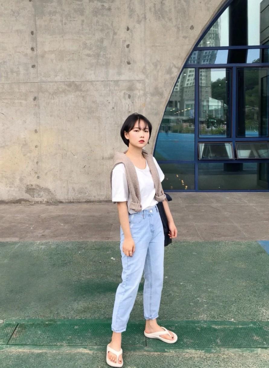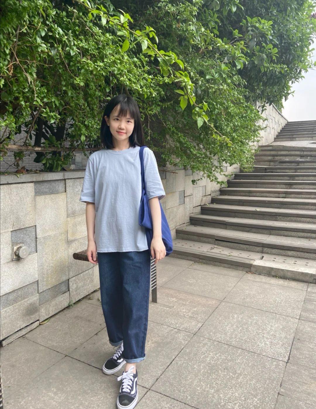 Both are light blue, the light blue T-shirt worn by the young lady in the previous picture The tone is brighter, and the T-shirt worn by the young lady in this picture is a light blue T-shirt with a little dark tone, so if a bright-toned blue T-shirt is more suitable to match with light blue, For washed blue jeans, this dark-toned light blue T-shirt is best paired with dark blue or gray-blue jeans, so that the combined outfit will be more stable and show off your temperament.