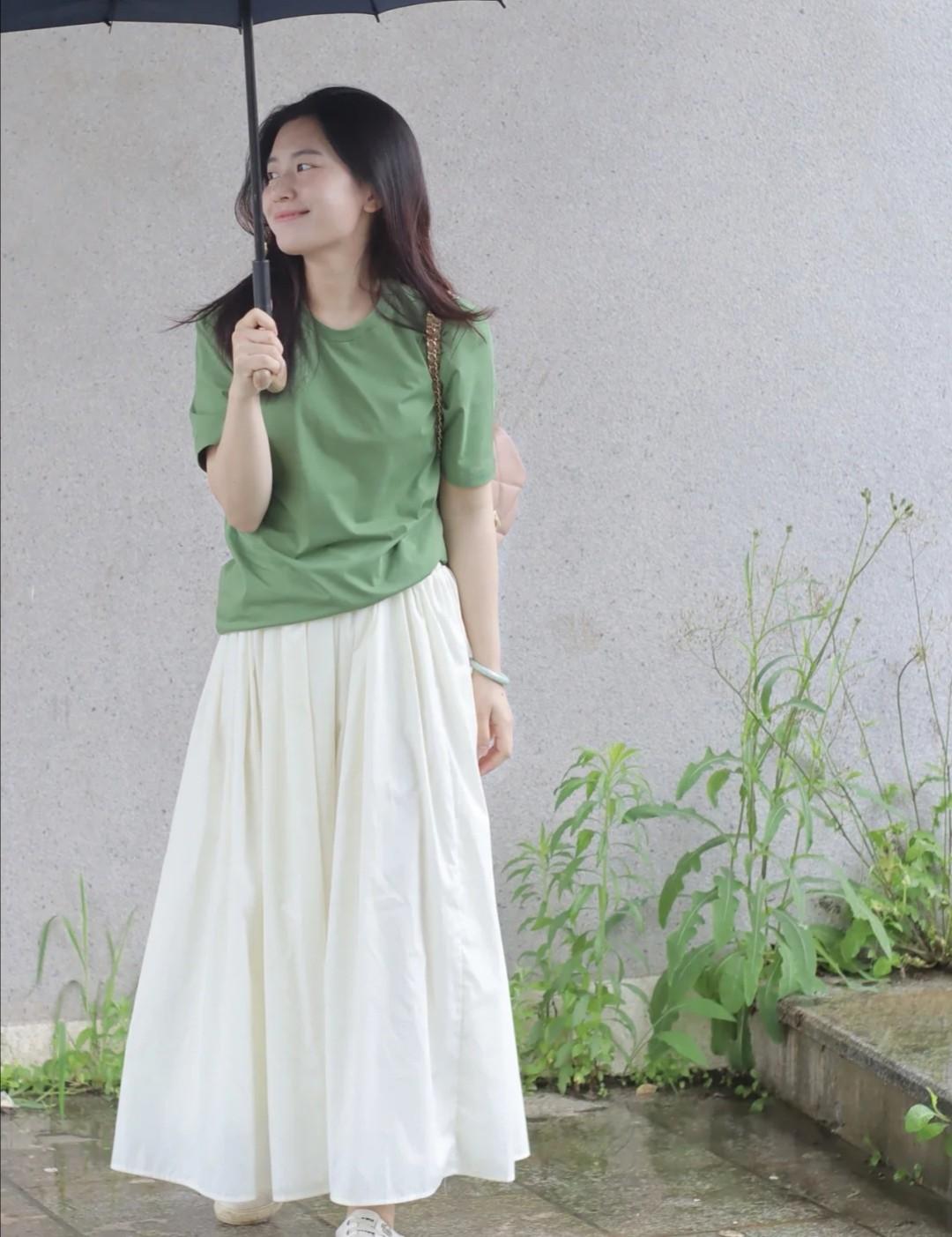 Bean green T-shirt is more suitable to match white bottoms, such as white shorts or white skirt, the girl is wearing this one Bean green T-shirts look great whether paired with skirts or trousers, but a solid-color T-shirt with a square collar that highlights the collarbone is more suitable to be paired with an umbrella skirt. This way, wearing one set will give you a “full aura” A sense of sight. Bean green is a fresh color, so when matching, ladies only need to choose some light-colored or green-colored clothes to match it. It is best to avoid eye-catching colors such as royal blue and bright red. clothing.