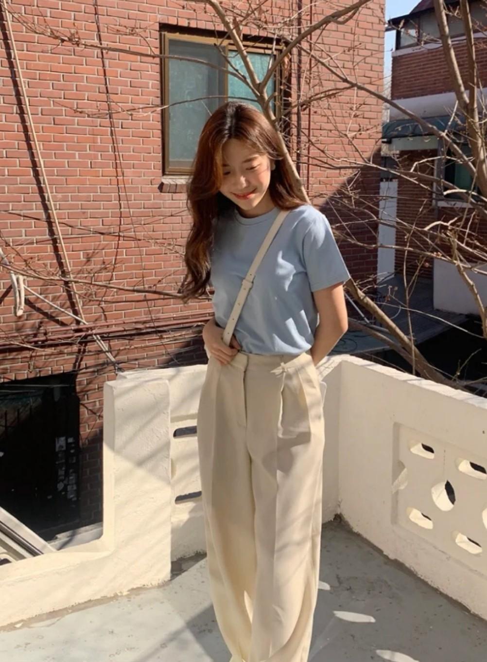 Light blue T-shirt is warmer and fresher. Girls can choose bottoms with plaid elements when matching. Pair it with it, such as a fishtail style black and white plaid skirt, or the plaid floor-sweeping pants loved by the student party; it can also be paired with beige bottoms. Beige suit pants or beige skirts are very suitable for this color. As for clothes, the young lady is wearing a sky blue and off-white outfit that is very fresh and lovely.