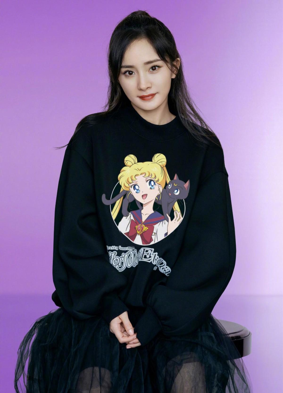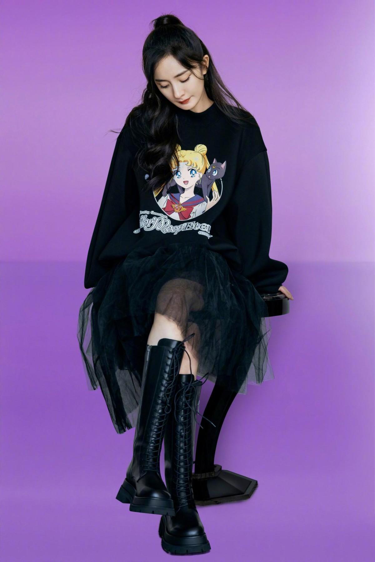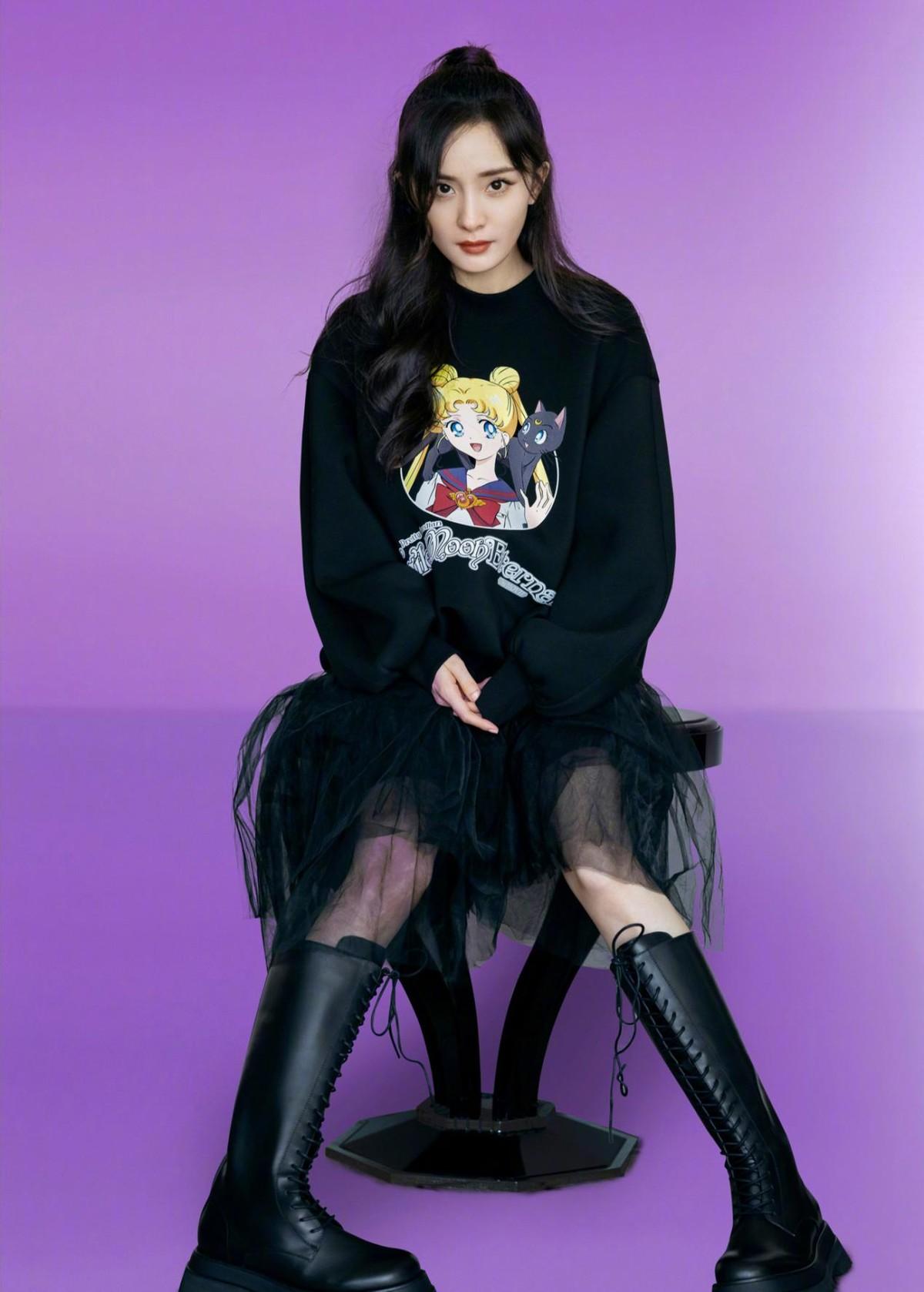 Yang Mi, known as the “Queen of Style”, has her own set of ideas in the field of fashion, and her dressing style is also very changeable, either pure and cute, or elegant. And she also likes to share her looks on social platforms, such as this sweet and cool look, with a black sweatshirt paired with a gauze skirt of the same color, which looks playful and cool.