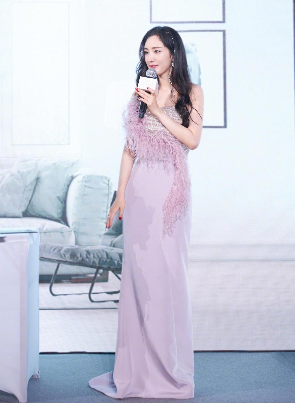 The floor-length skirt design is quite dignified and intellectual. It also visually extends the lines of the legs, making Yang Mi appear slimmer. This long dress is also unique in the combination of fabrics. First of all, the fine glitter fabric in the upper part is exquisite and bright. It makes the purple dress more noble. It is decorated with feathers of the same color without destroying the overall feel. At the same time, it adds a bit of elegance and lightness, embellishing the sweet style.