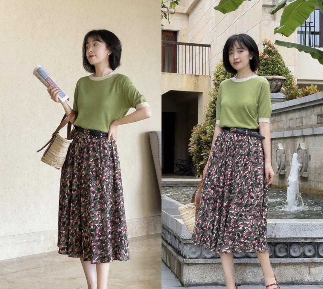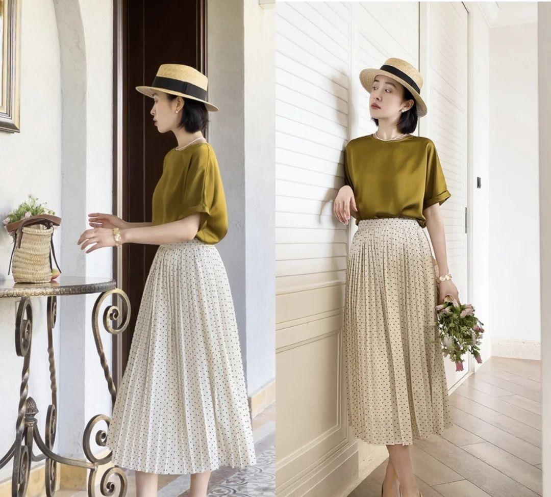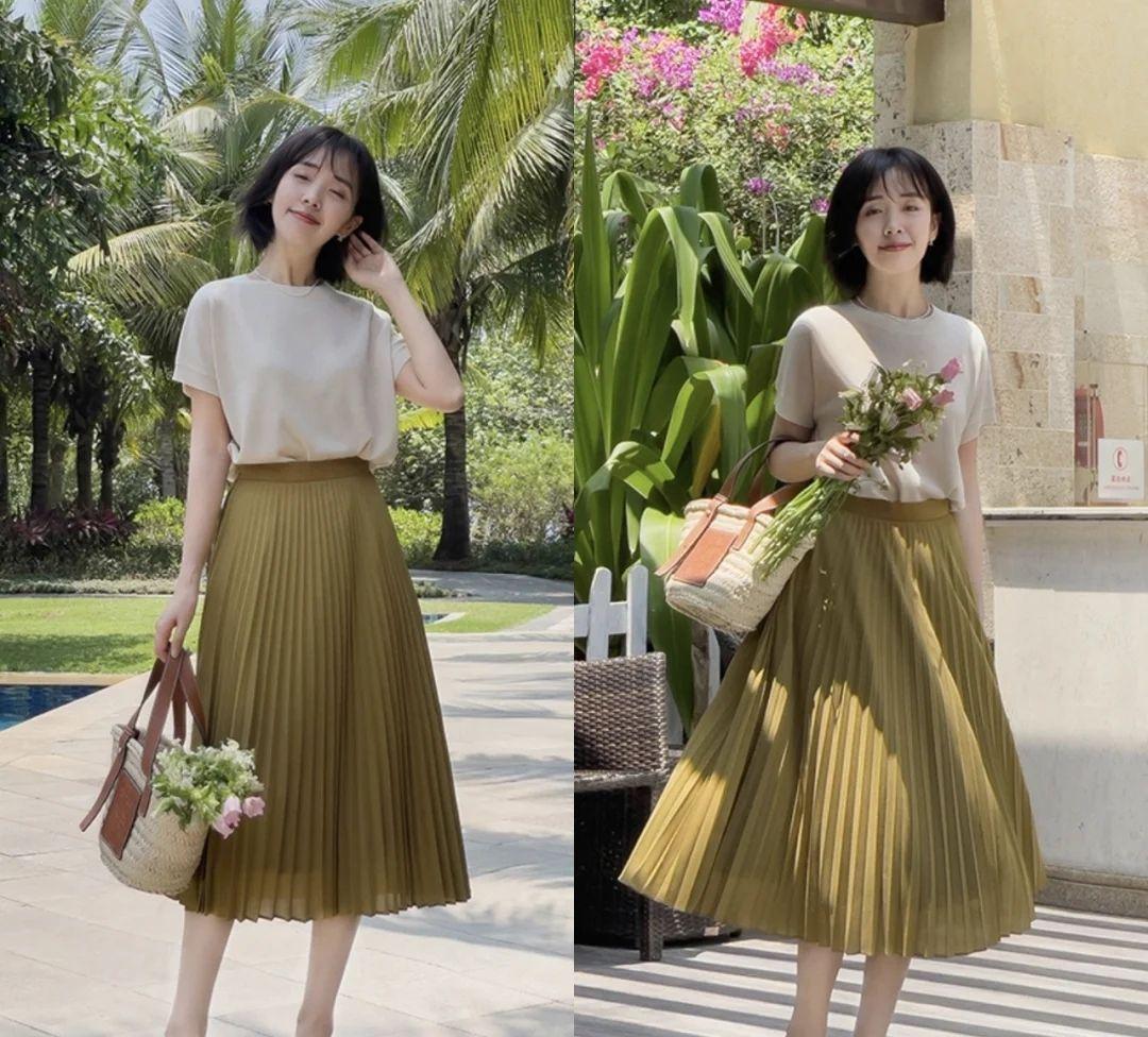 T-shirts and skirts are very refreshing items in themselves. They are very flattering when worn in summer. If you want to create a harmonious combination, you must first choose the right color matching method that suits you. The darker color combination is more suitable for women who want to look whiter. A light beige T-shirt looks very intellectual, and paired with a yellow-green pleated skirt, it is elegant and fashionable.