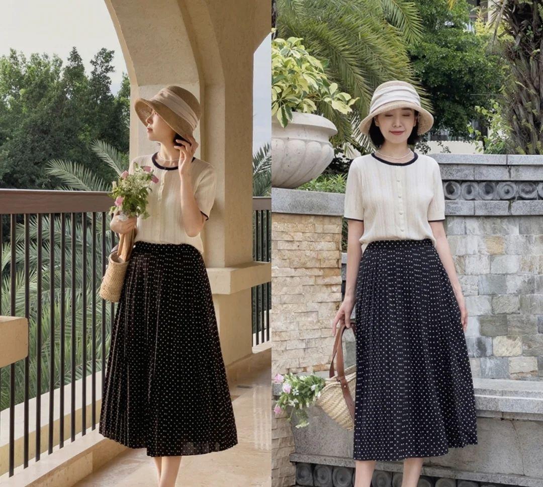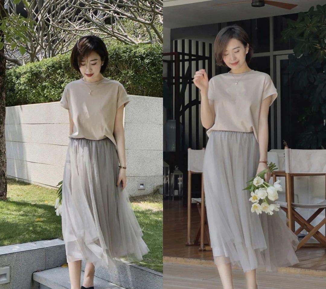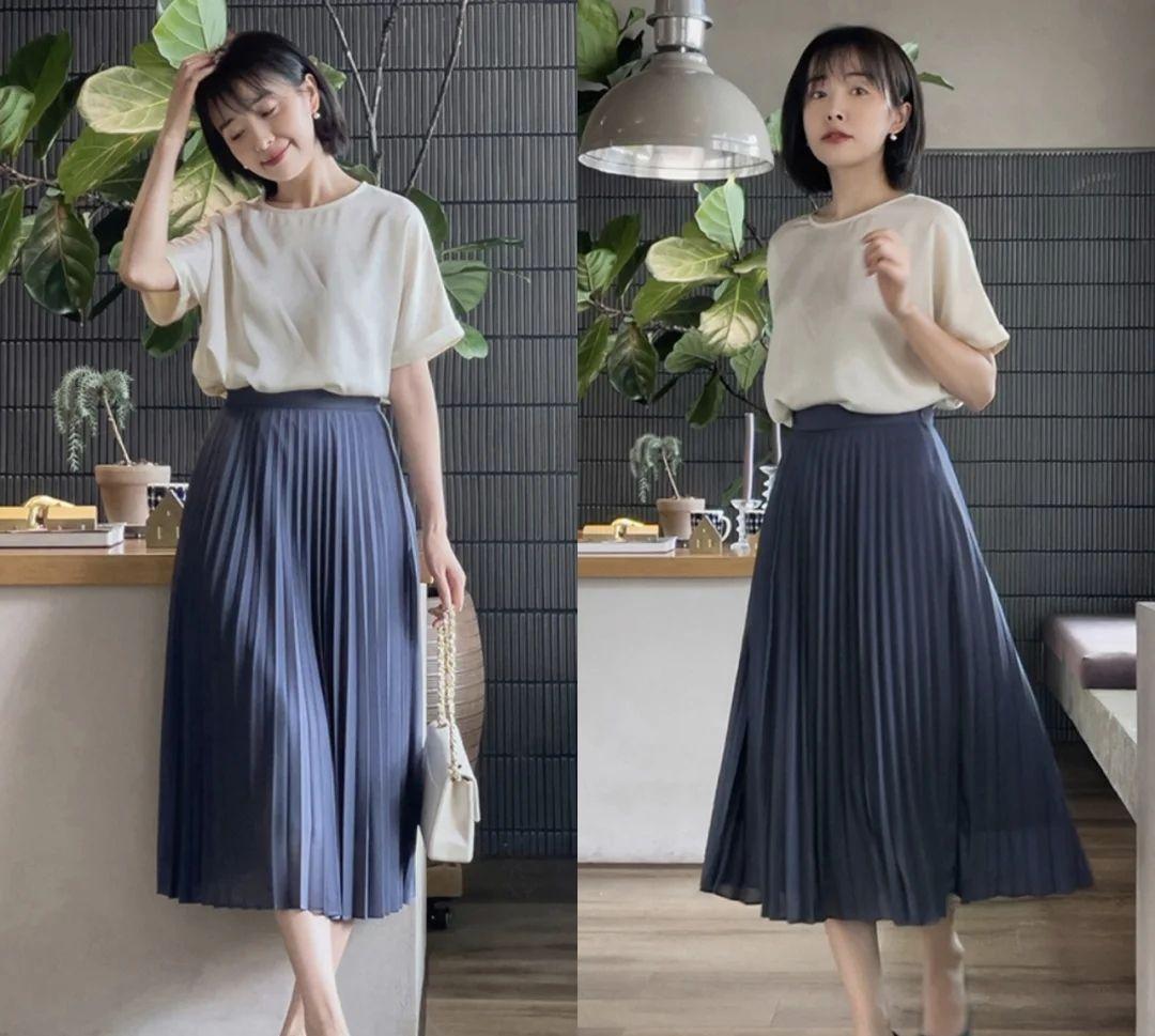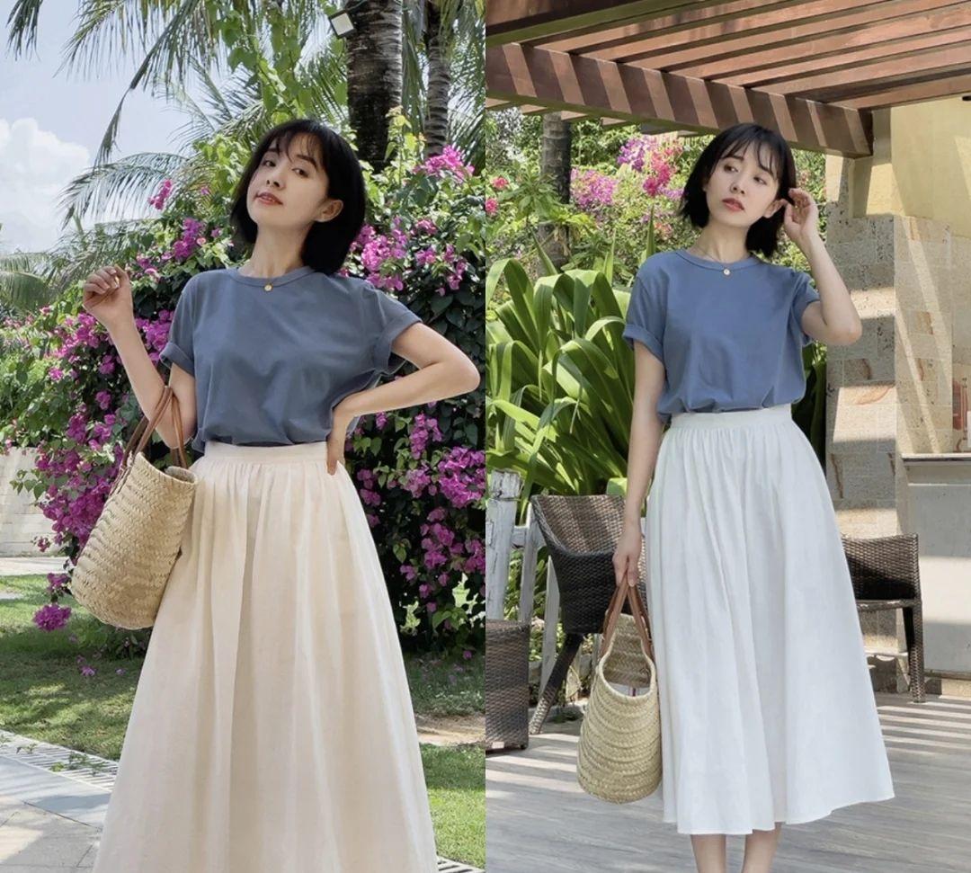 T-shirts in light colors such as beige or milky white are very versatile and very suitable for summer. If you want to wear them with a sense of stability , you can wear a dark-colored skirt on the lower body, such as navy blue or sapphire blue, which are good choices.
