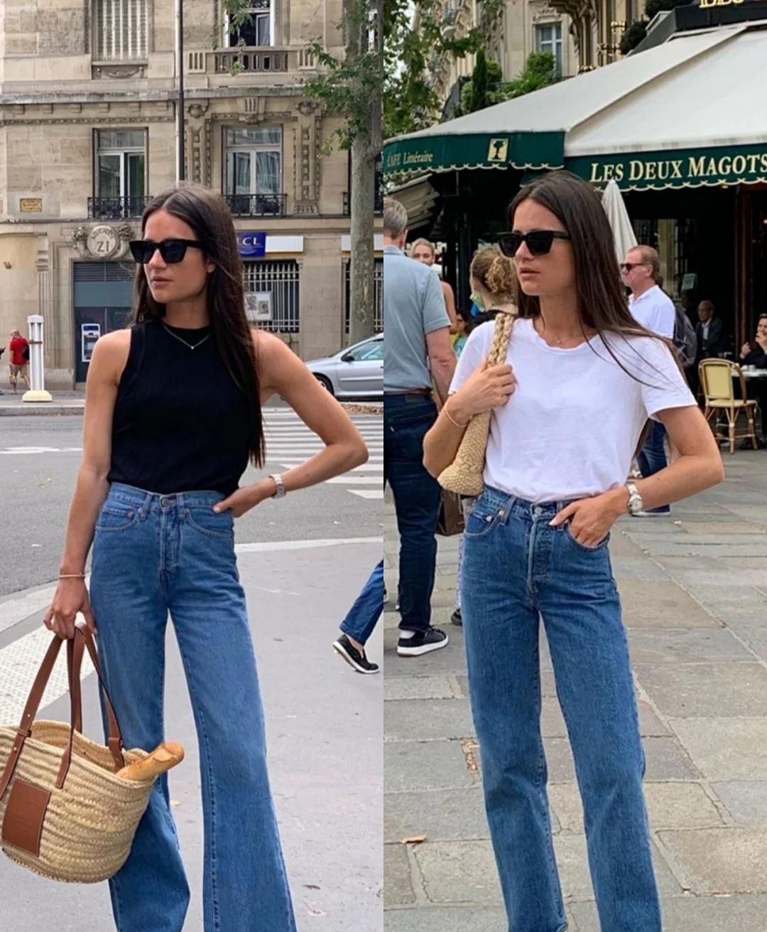 A white T-shirt paired with dark-colored high-waisted jeans can present a complementary sense of color matching through the color matching of light at the top and dark at the bottom. Girls who are not very satisfied with their leg shape can try this kind of dark-colored pants.