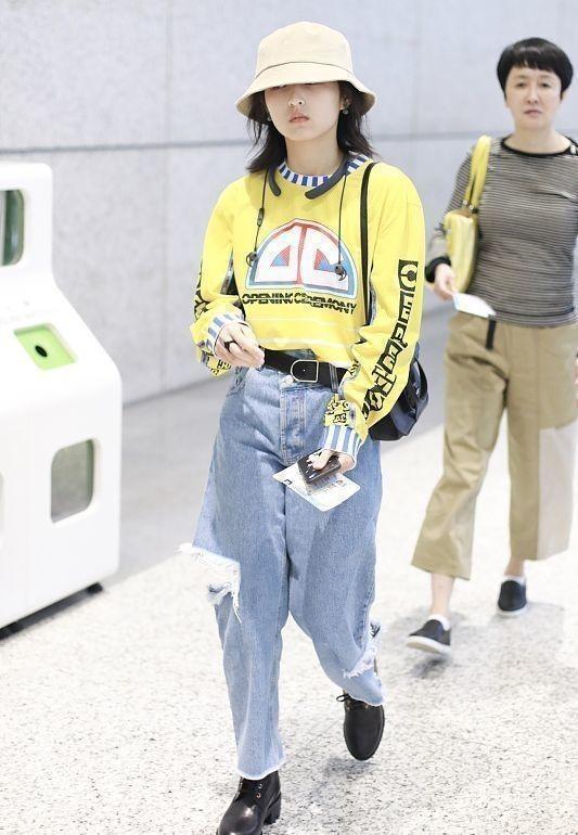 The yellow cartoon sweatshirt is really suitable for Zhang Zifeng. The bright yellow can highlight the whiteness of the skin color. Partially decorated with cartoon elements can highlight the vitality and sweetness of the girl, and the broken lower body The design of hole jeans is very personalized, and they are very fashionable and fashionable when shot on the street.