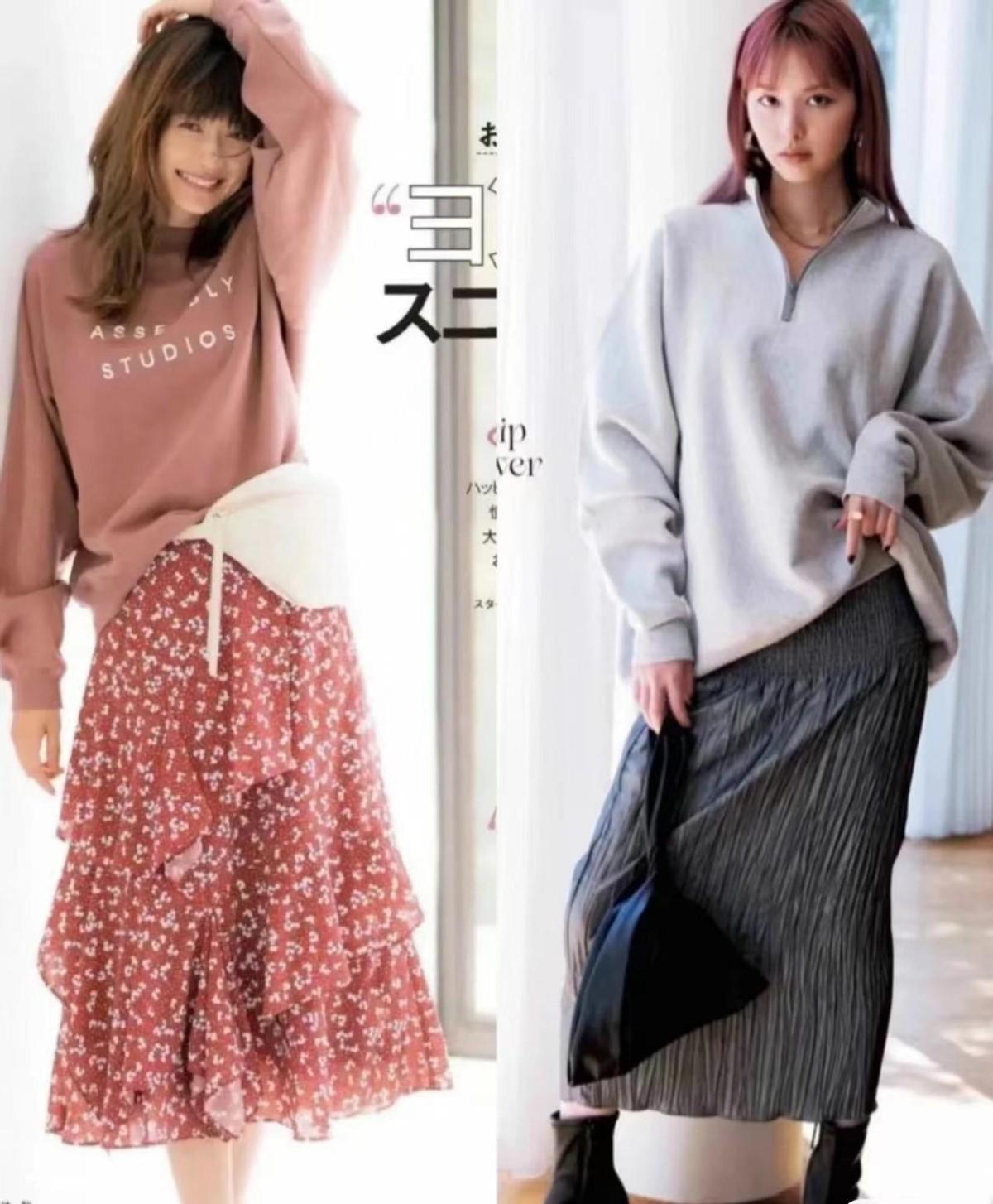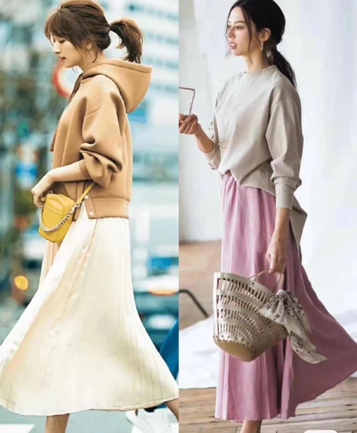 The first is the combination of a sweatshirt and a skirt. A casual sweatshirt paired with a feminine skirt can show off enough fashion while ensuring comfort.