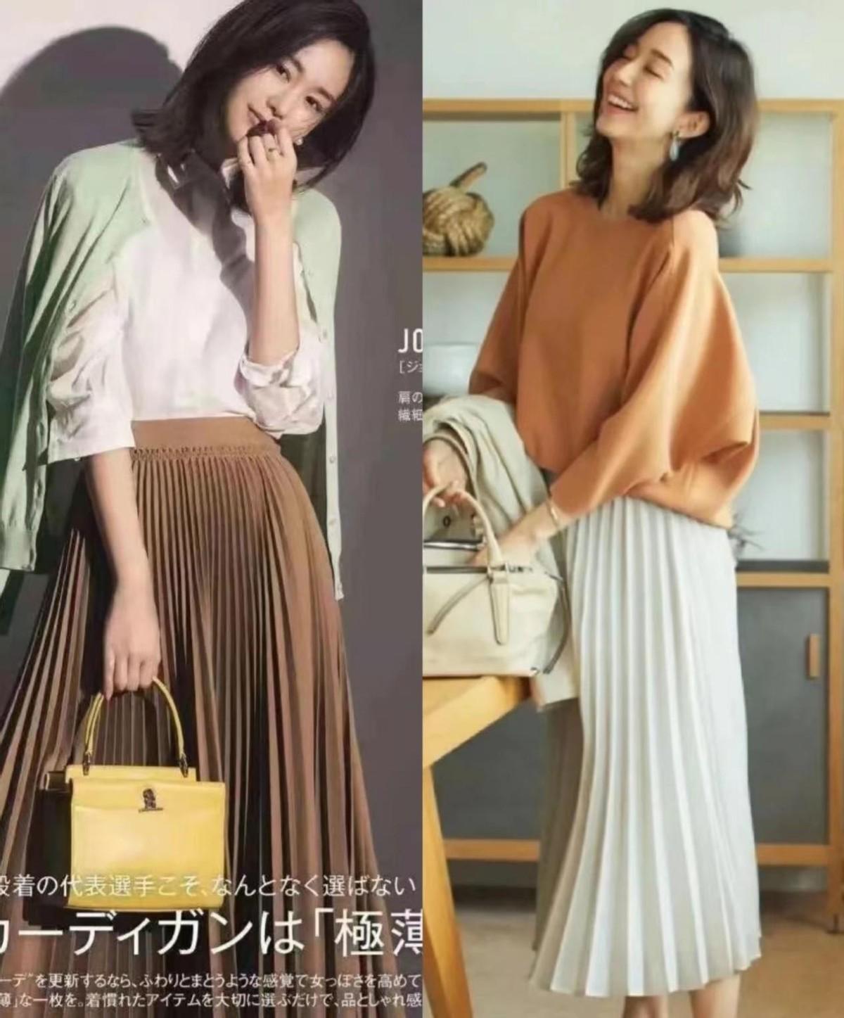 Pairing the lower body with a pleated skirt can enhance femininity and create a swaying feeling when walking.