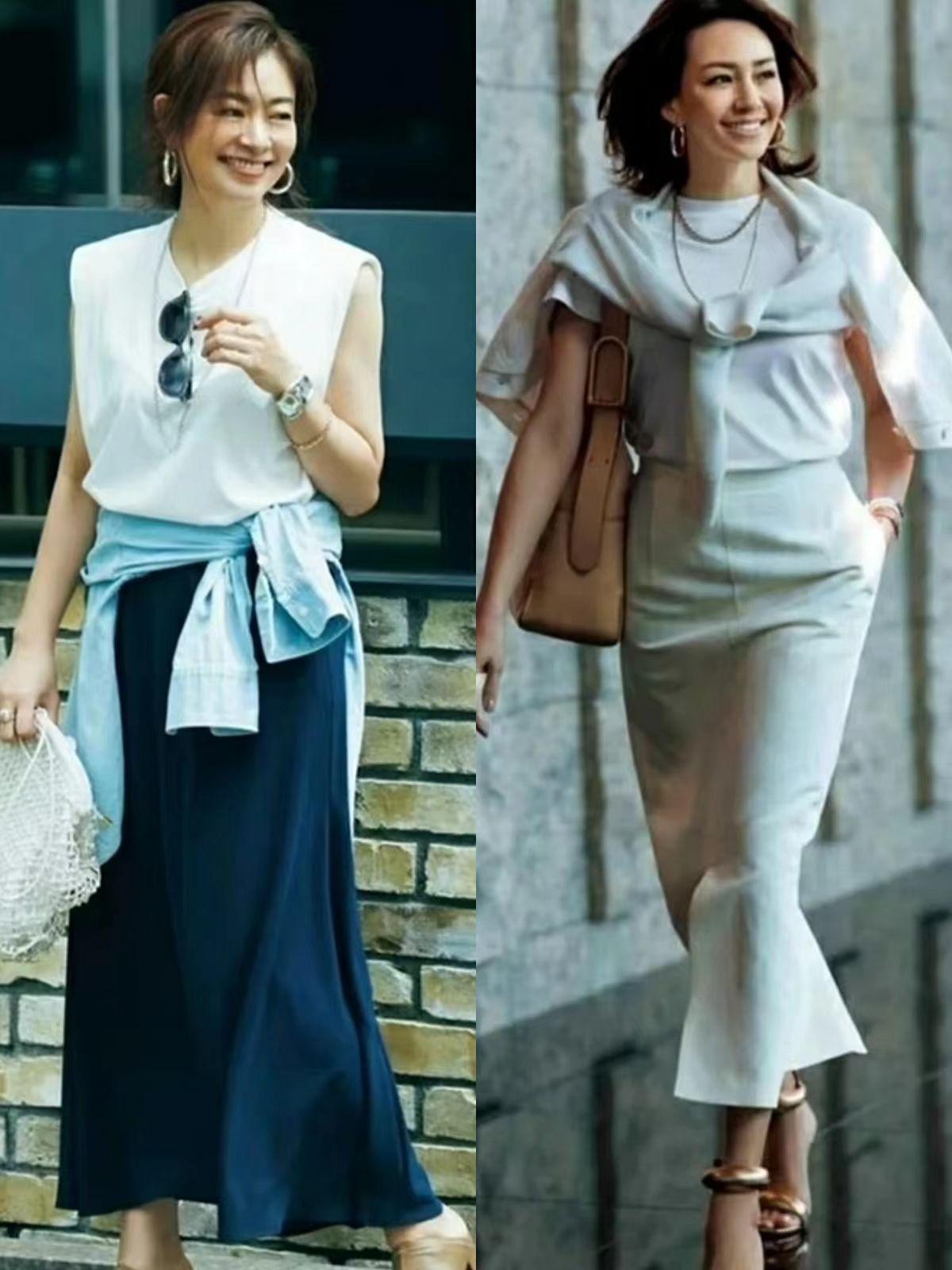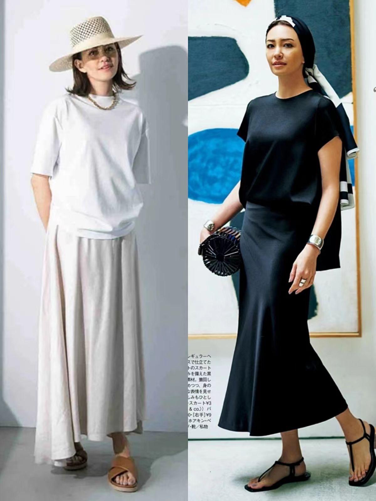 The combination of white T-shirt and white below-the-knee skirt, black T-shirt and black below-the-knee skirt is simple and advanced, perfectly interpreting the elegance and high-end of mature women, simple but not simple .